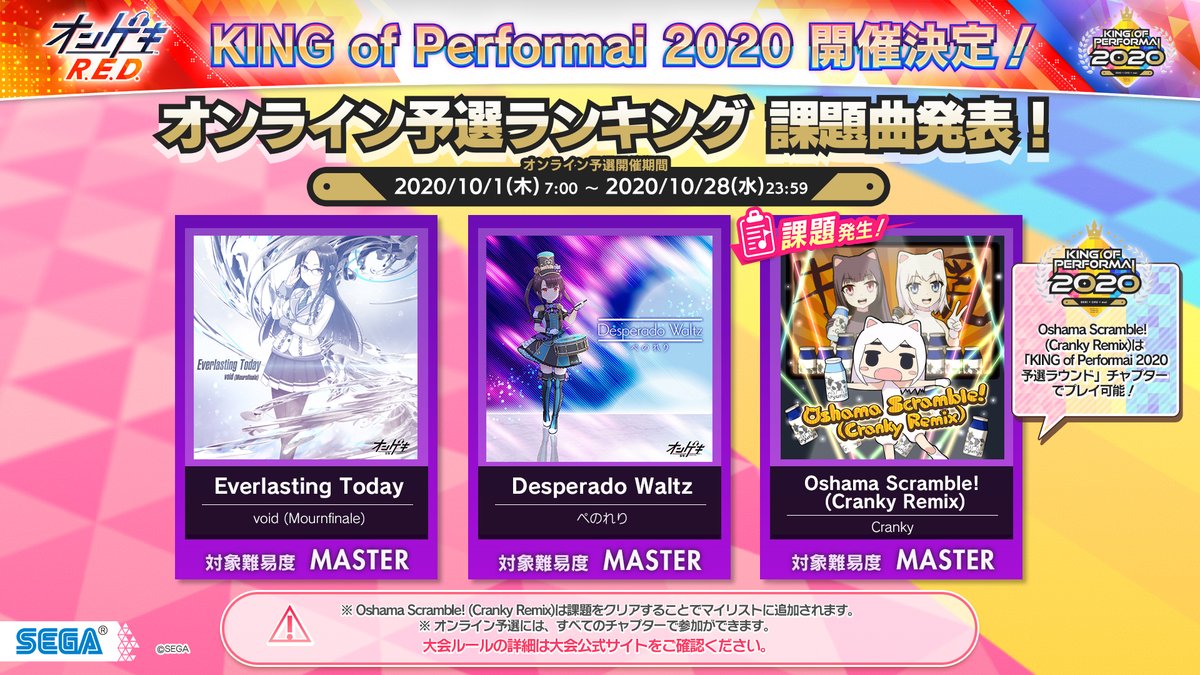 『KING of Performai 2020』オンゲキのオンライン予選課題曲はこちら!「Oshama Scramble!(Cranky Remix)」は、KoP予選ラウンドチャプターでプレイすることができます!