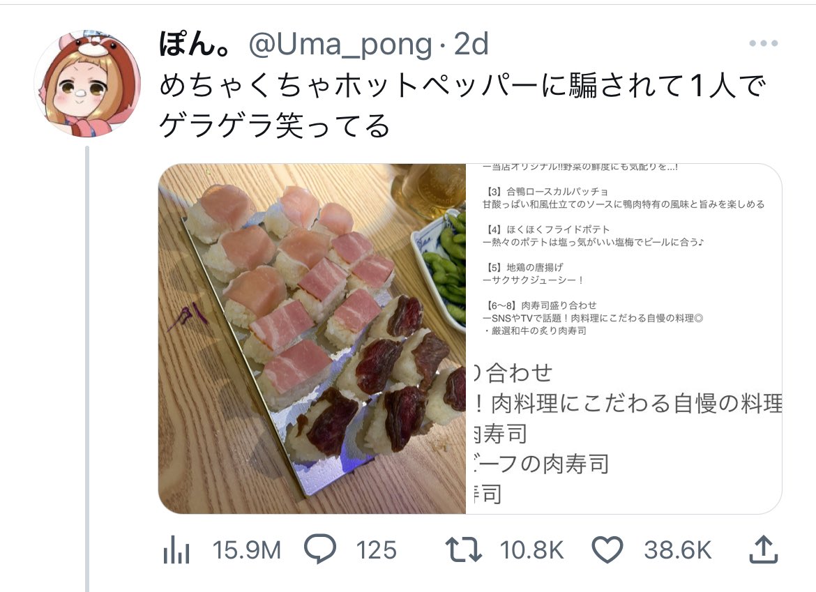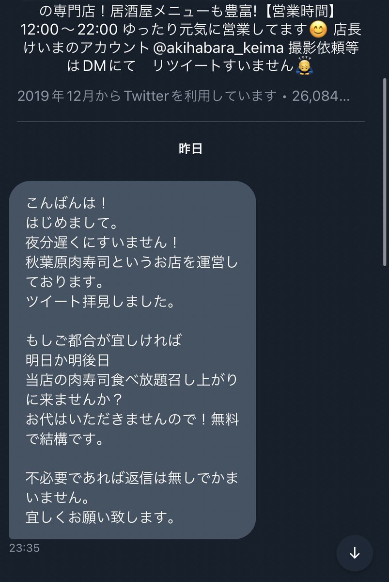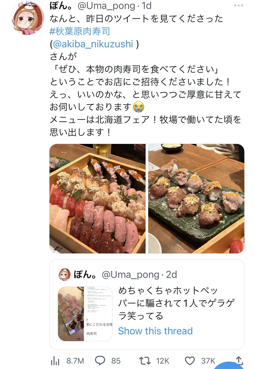 秋葉原 肉寿司のSNS担当が秀逸すぎる。Twitterのバズは数日程度なのでおそらくツイートを見てすぐ「明日か明後日に来て」と呼んでいるあたり賢い。肉寿司の原価だけで1000万近くのインプと数千人のフォロワー獲得したかと思えば費用対効果が凄そうすぎる。