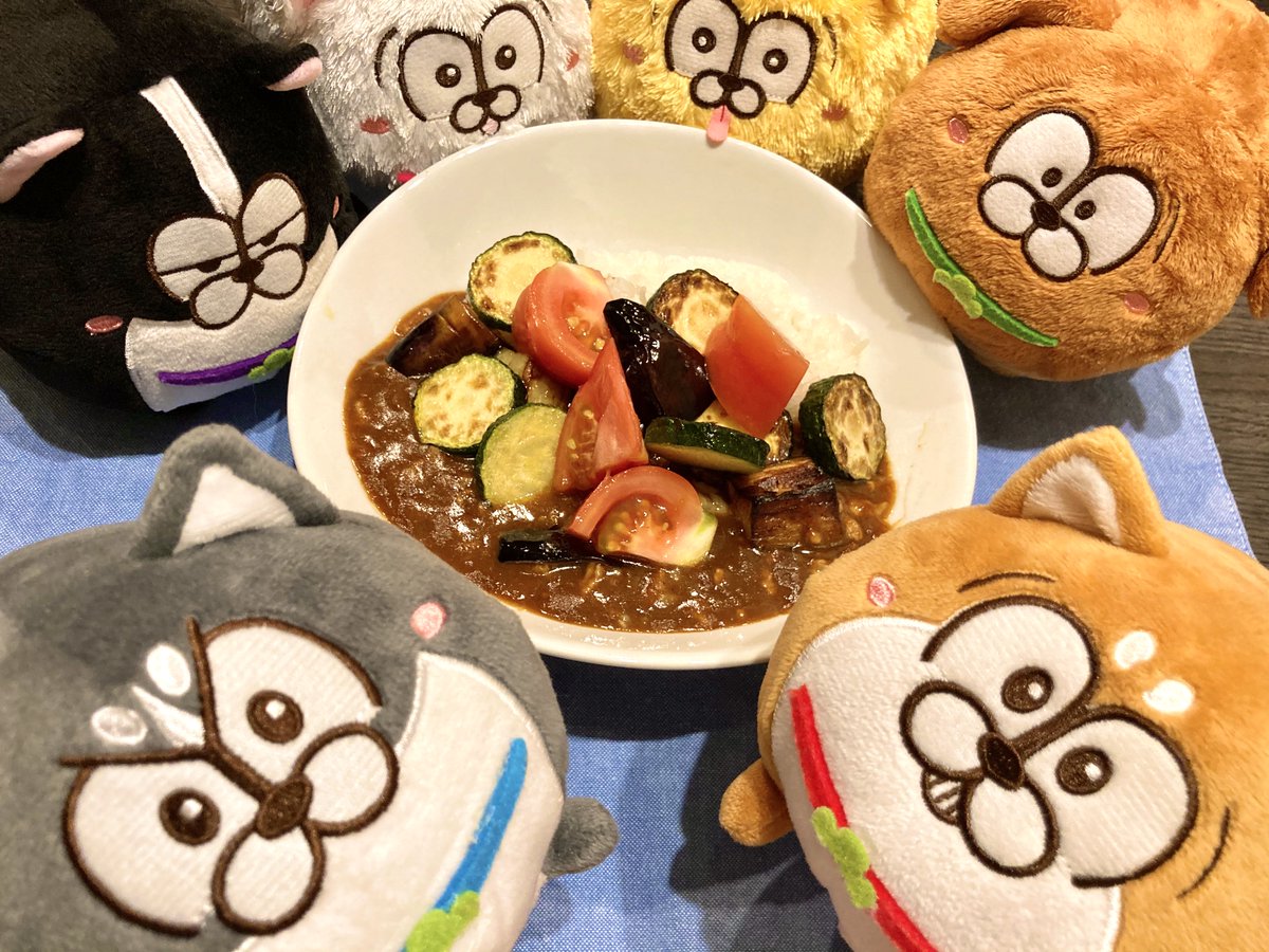 よるごはんはなつのおやさいのかれーでした! とってもいいにおいで松犬たちがちかくにあつまってきました。