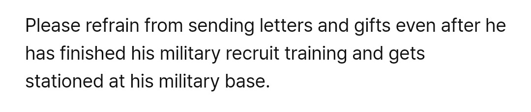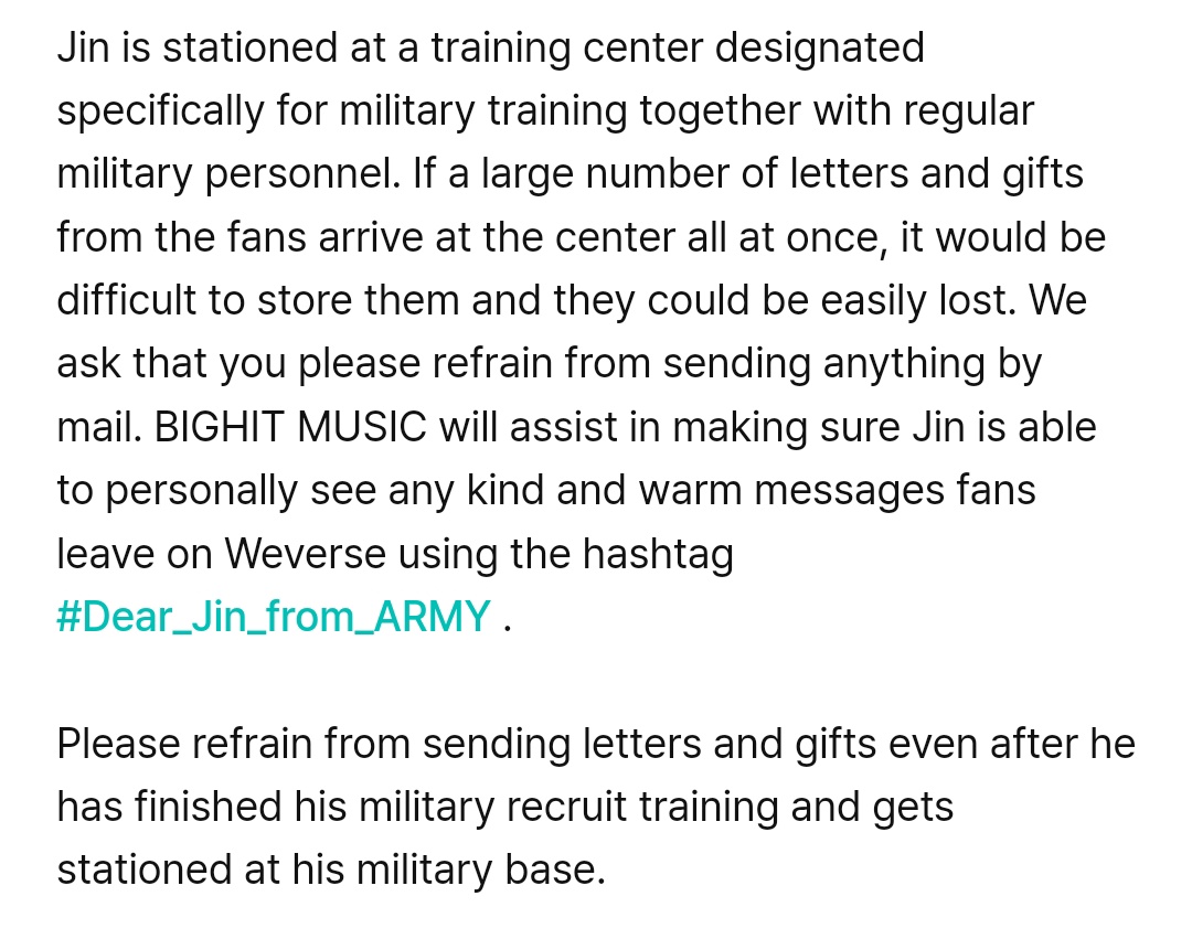 they are basically saying to let seokjin serve in PEACE. if you want to send him a letter, do it on weverse and if you disobey this that means you don't care about seokjin at all.