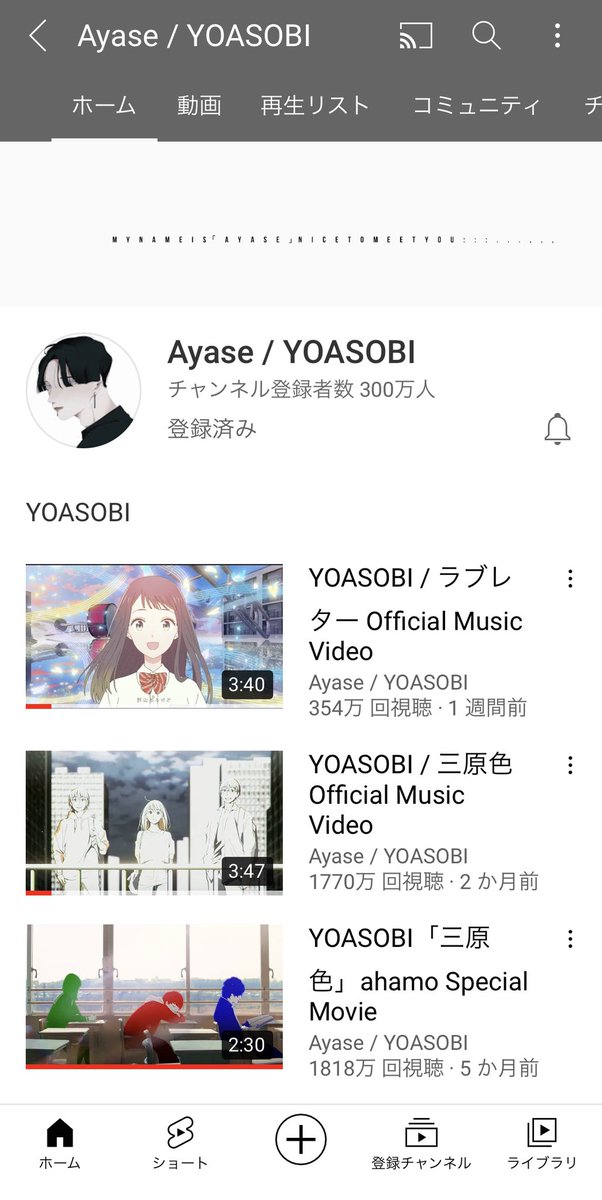 Ayase / YOASOBI YouTubeチャンネル登録者数が300万人を突破!