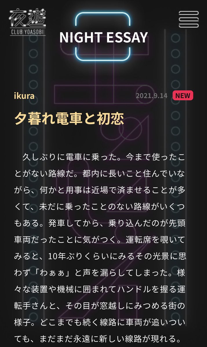YOASOBIオフィシャルファンクラブ「CLUB 夜遊」ikuraのエッセイ最新回「夕暮れ電車と初恋」公開🚃