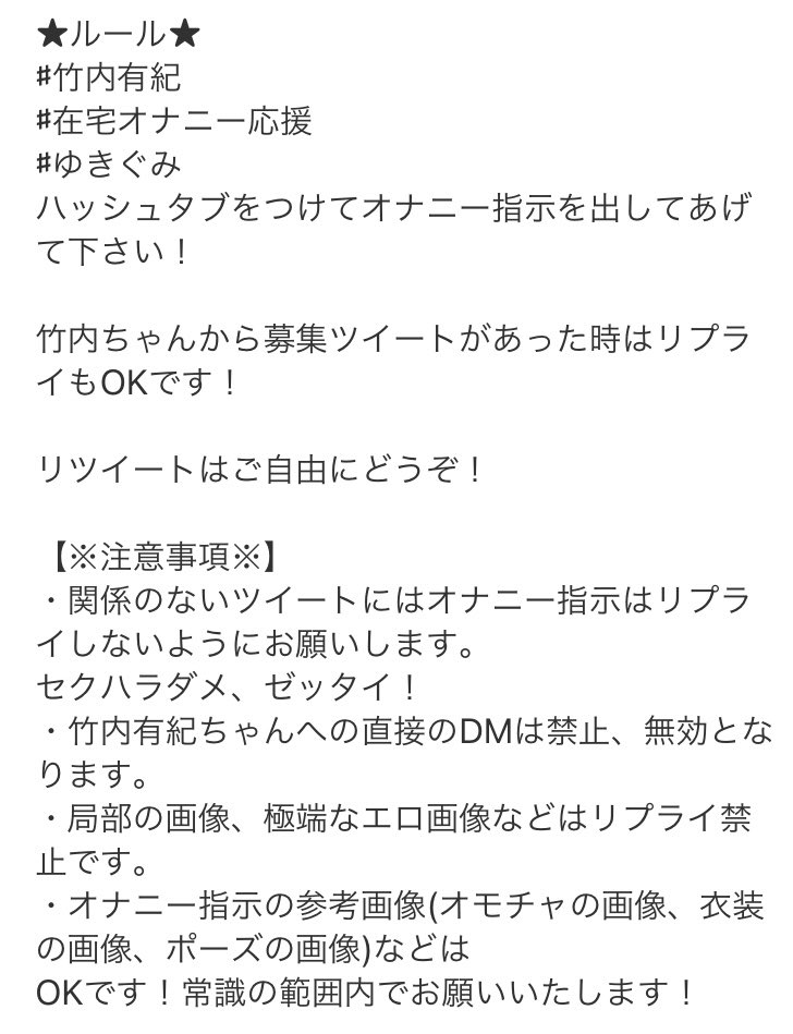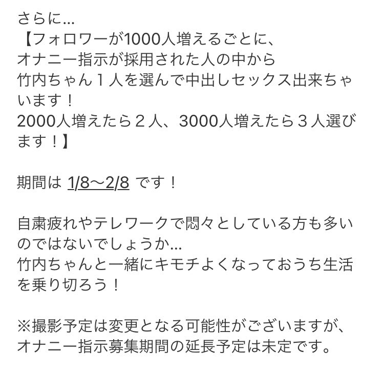 あの企画依頼がついにきました🥺 【竹内有紀に最高のオナニー指示を出せたら中出しSEX!】 自分が指示した竹内ちゃんのエッチな姿が見れるかも!? 来月の撮影予定までの1か月間、次回の作品に収録する竹内ちゃん宅での 自撮りオナニーの内容を皆さんのツイートで指示して下さい! ※詳しくは画像へ