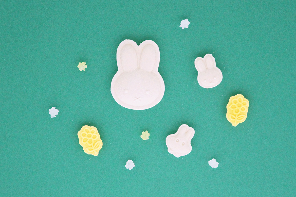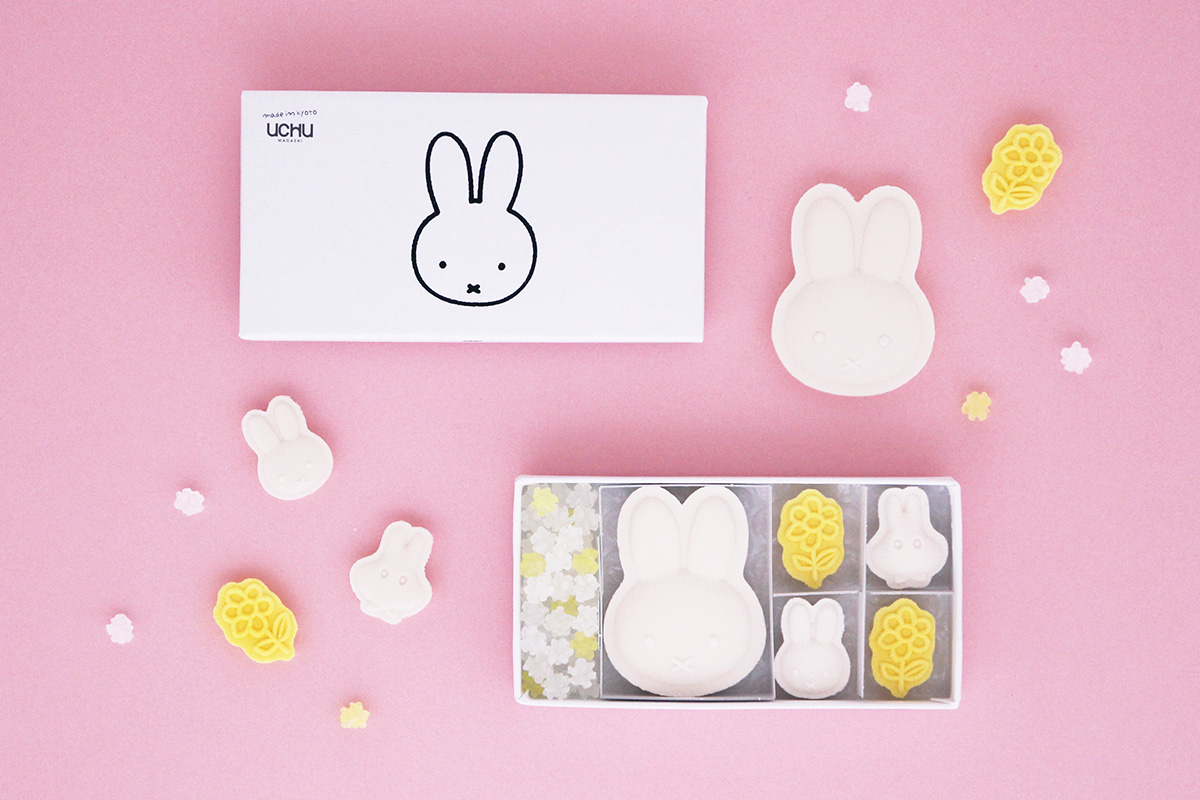 京都の和菓子屋さん、UCHU wagasiとコラボレーションした、純日本糖の和三盆糖で作られたミッフィーの落雁です。