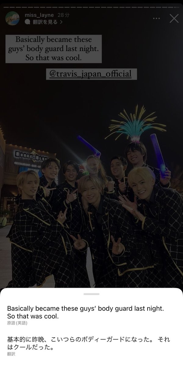 miss_layneさん、たくさんトラジャのこと載せてくれる〜〜〜ありがて〜〜〜!って思いながら和訳ボタン押したら死ぬほどおもろかった「基本的に昨晩こいつらのボディーガードになった」←おもろすぎるinstagram.com/stories/miss_l…