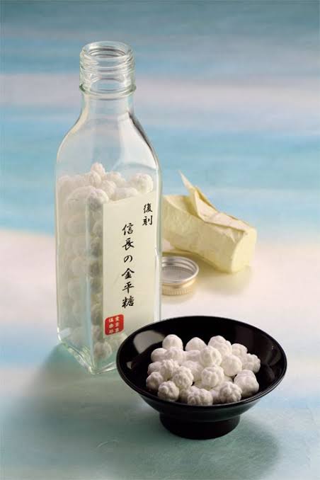 ”こんぺいとう”の名はポルトガル語で砂糖菓子を意味する「confeito(コンフェイト)」が由来であり、その歴史は、1569年にポルトガルより日本に来た宣教師であるルイス・フロイスが瓶入りのコンフェイトを織田信長に献上した事が、日本でのきっかけであるとされている。