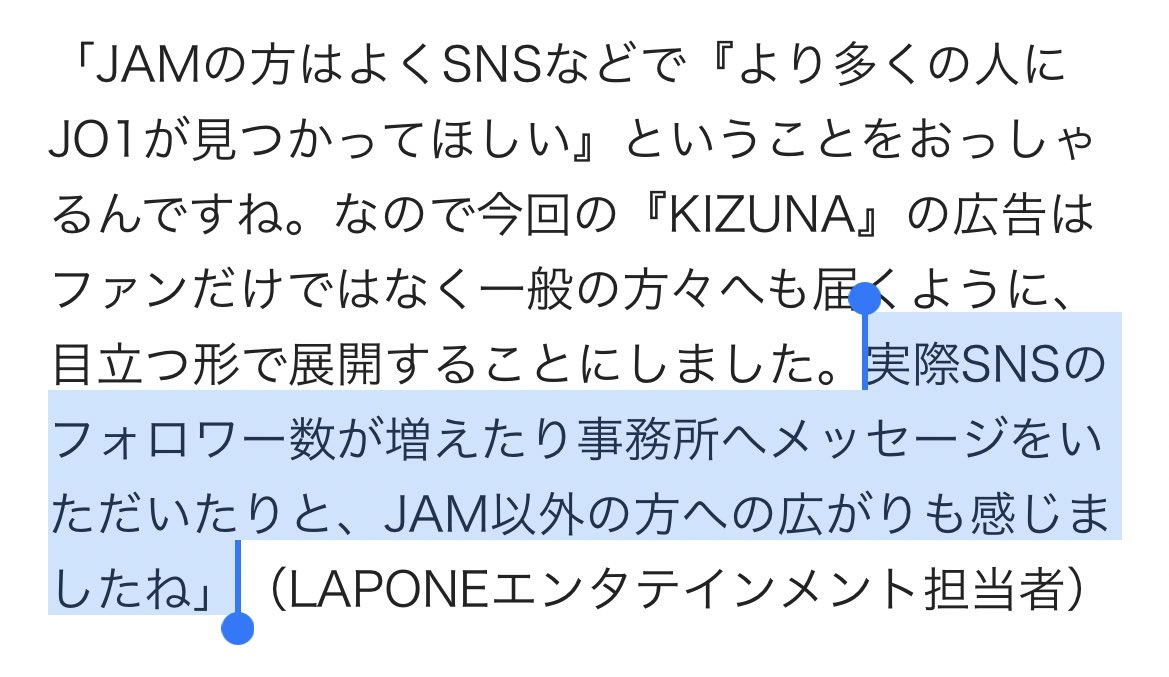 新宿駅の広告こんな反響もあったんだ。確かに広告前にいると一般の人が会話の話題にしてくれたりSNSにあげてくれたりしてたしJAMじゃない人にJO1を見つけてもらうことが目的の1つだったら大成功だね