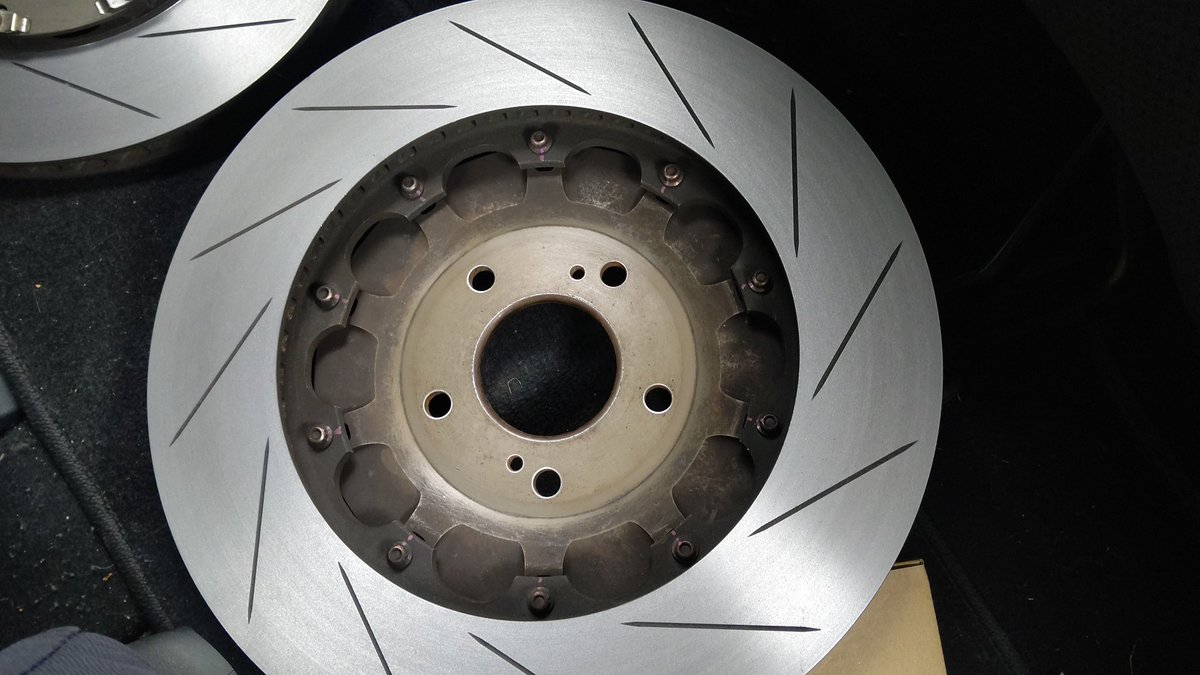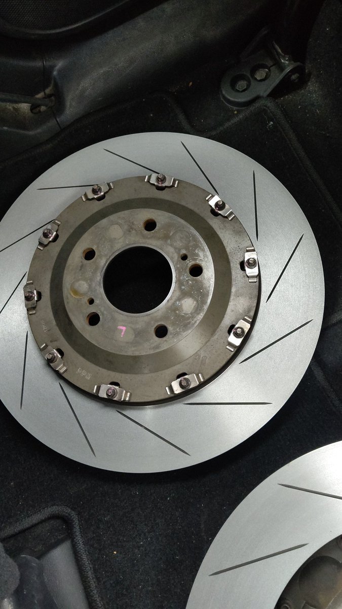 ディ〇セ〇ローターまともに検品してないんかな() 研磨屋さんいわく、リアは内側の歪みが酷くてフロント2ピースは当たり付けもやったのに聞いたら変形してたとさ。なんで新品で研磨せないかんのよ💢 結構削ったなー😭後で測ろ