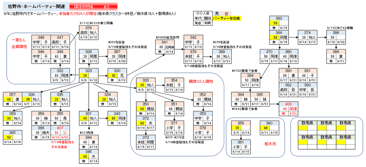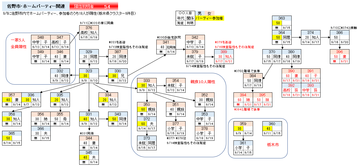 <311人目>小山市の20代女性。8/29群馬県で友人12人と会食、9/1発症。9/1~3別居家族宅に宿泊。濃厚接触者の同居家族4人のうち小学生を含む3人が陽性判明(312~314人目=詳細は明日発表)。