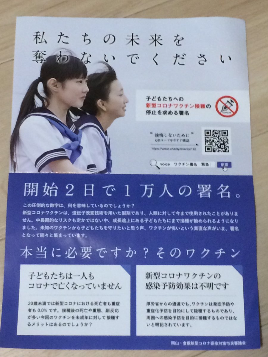 なんか家にやべぇチラシ入ってた。 >ワクチンは、遺伝子改変技術を~ ・違います。 遺伝子治療と勘違いしてない?mRNAワクチンに関して理解するために高校生物の教科書でも読んでください。 自分が理解できないから「危険だ危険だ!」と叫んで回るのは害悪です。