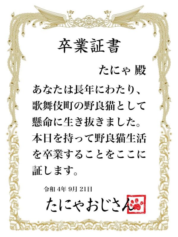 こちらの猫さん、歌舞伎町にて長く暮らしていたところ、たにゃ(おじさん)(@kabukinoraneko)との出会いをきっかけに野良猫生活から「卒業」されました。人と猫とのあいだの縁を感じるお話です。