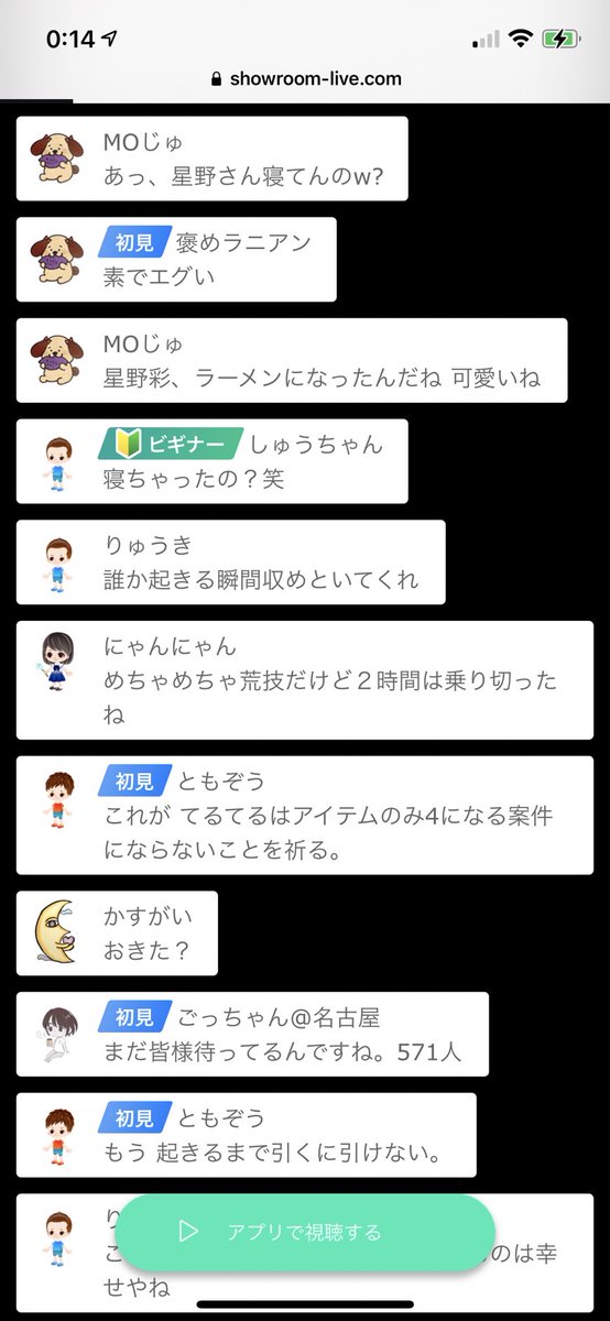 星野彩ですが、現在showroom配信中に寝落ちしております。