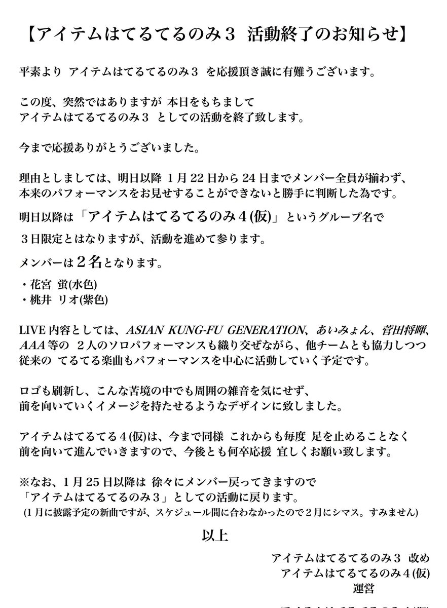 なお アイテムはてるてるのみ3ですが、メンバー自身が 新曲の作成・振付などの制作プロデュースを急遽ですが全て行います。