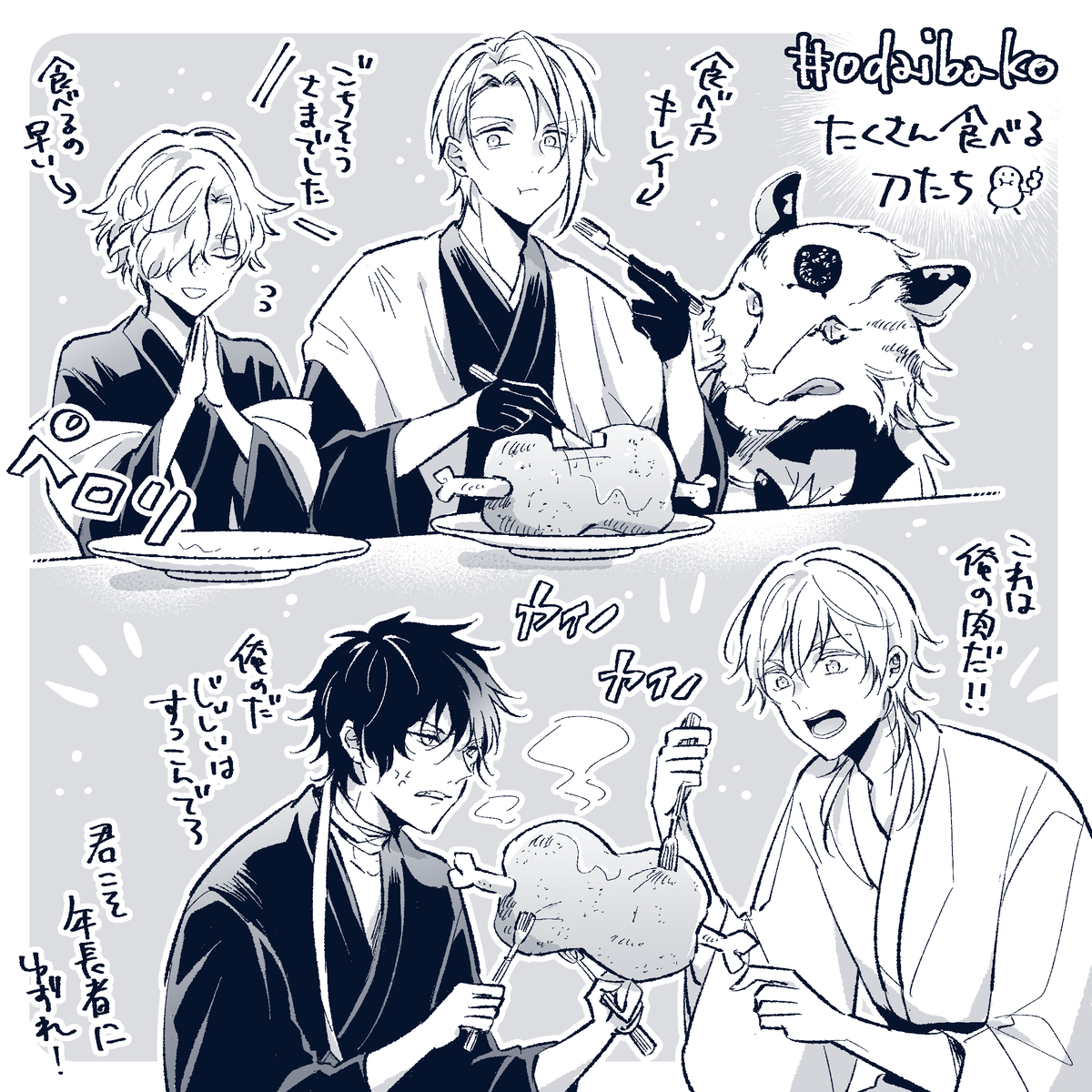 肉を食べたり主を励ましたりする鶴丸