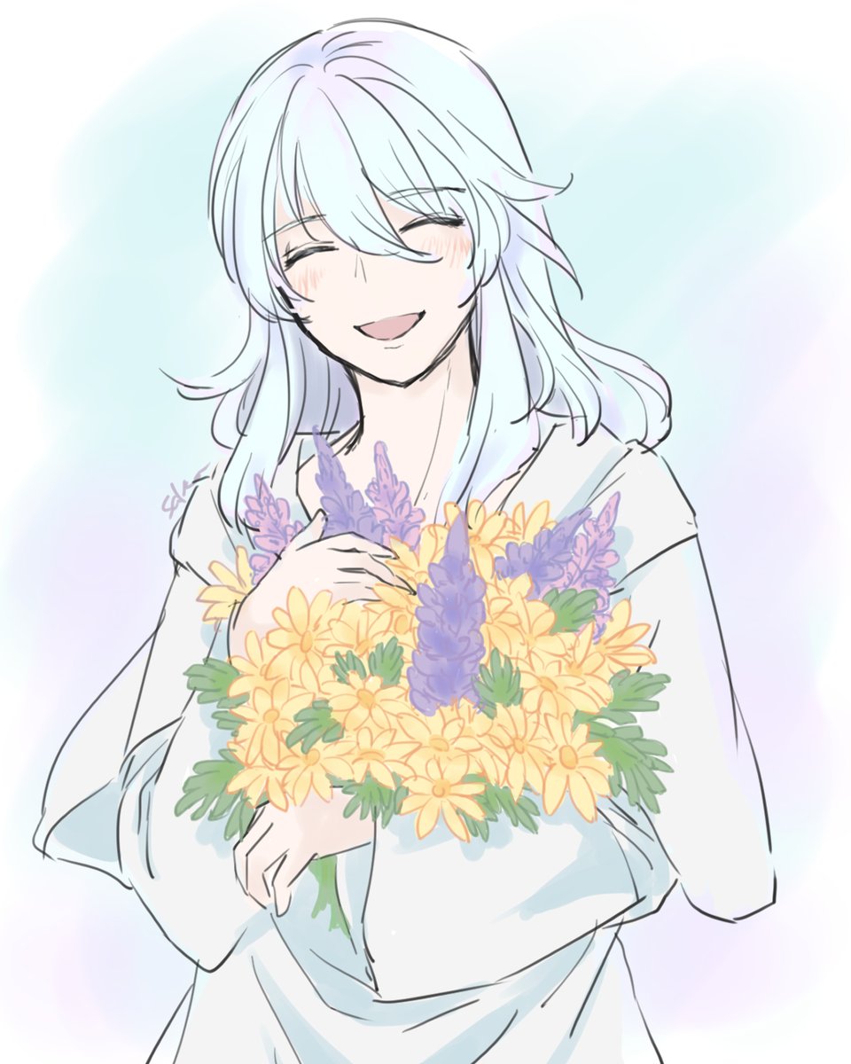 持ってるのは11月2日の誕生花ルピナスとユリオプスデージー(ぽいもの)