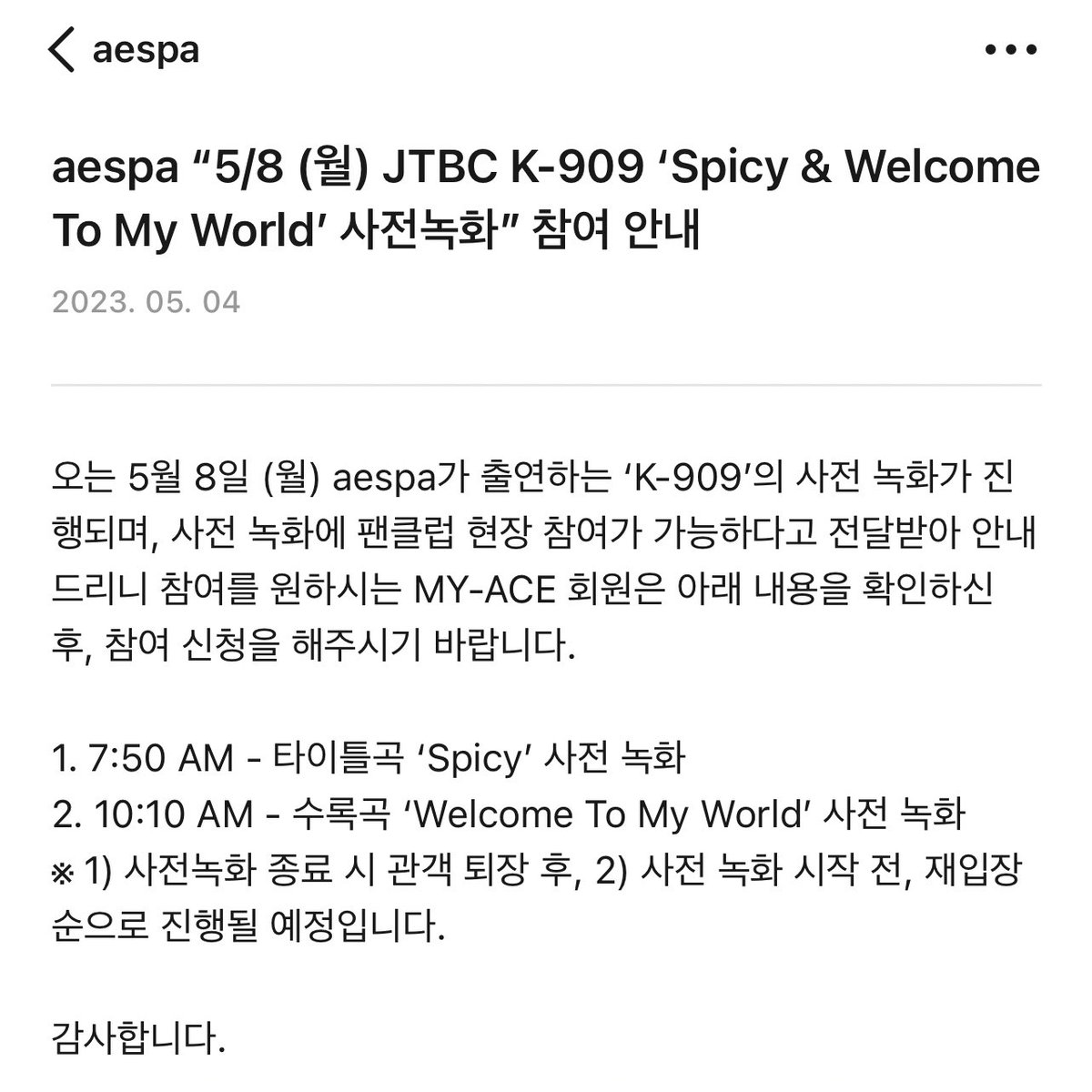 aespa will hold a Pre-Recording for JTBC K-909 on May 8th!