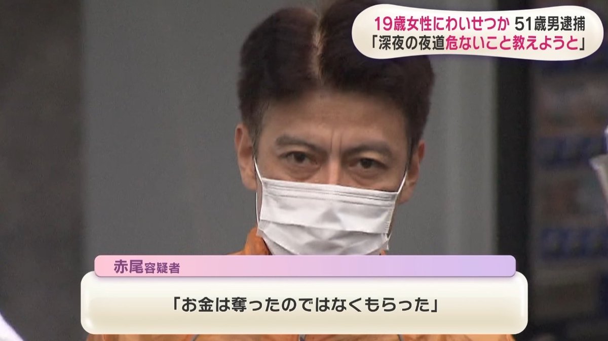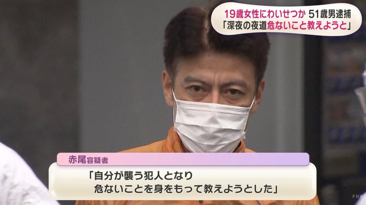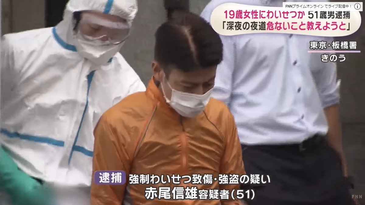 赤尾信雄容疑者(51)は、板橋区路上で女性(19)に「ホテル行こう」と声をかけ下半身を触り裏路地に引きずり込みケガをさせ8000円を奪った疑い。「自分が襲撃犯となることで夜道の危険さを身をもって教えようとしただけ」と語った
