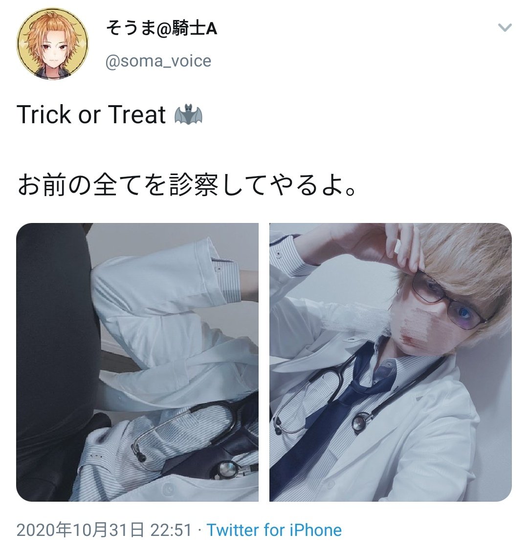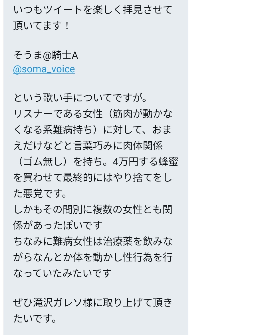 おはようございます。朝イチで読んだDMが「ハロウィンに『お前の全てを診察してやるよ』と言って医者コスプレを披露した歌い手(@soma_voice)が、ファンの女性(筋肉が徐々に動かなくなる難病持ち)に手を出した上、ただのハチミツを4万円で売りつけたことを謝罪した事件を取り上げて!」というDMでした