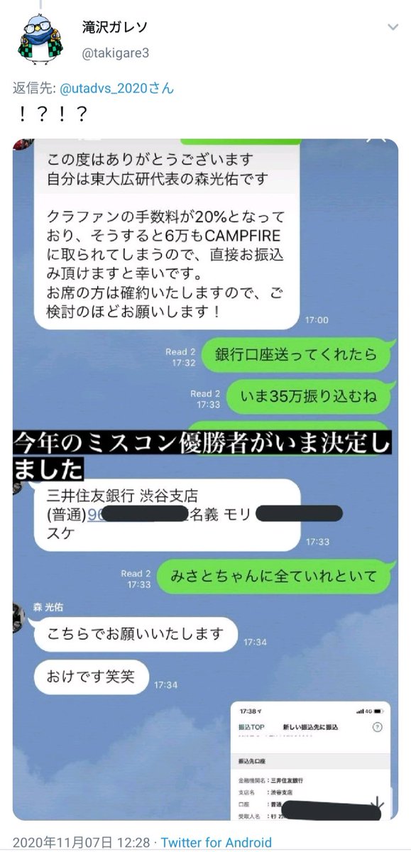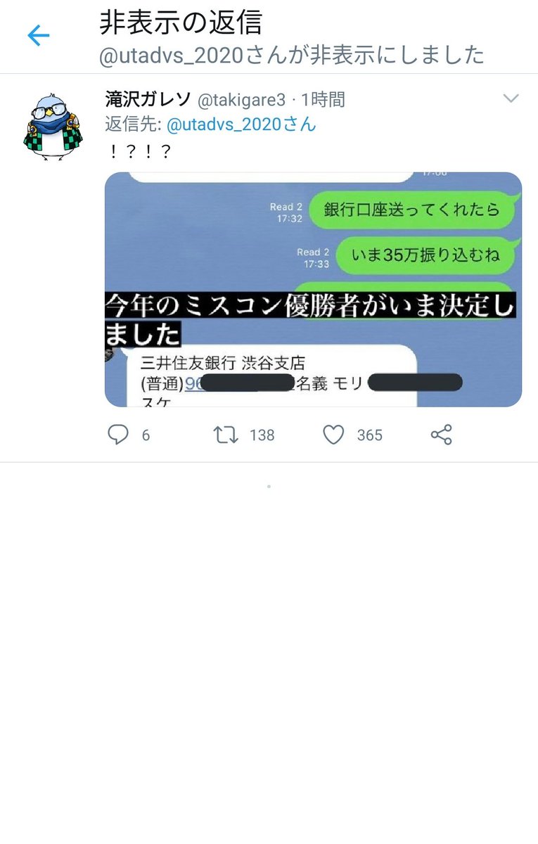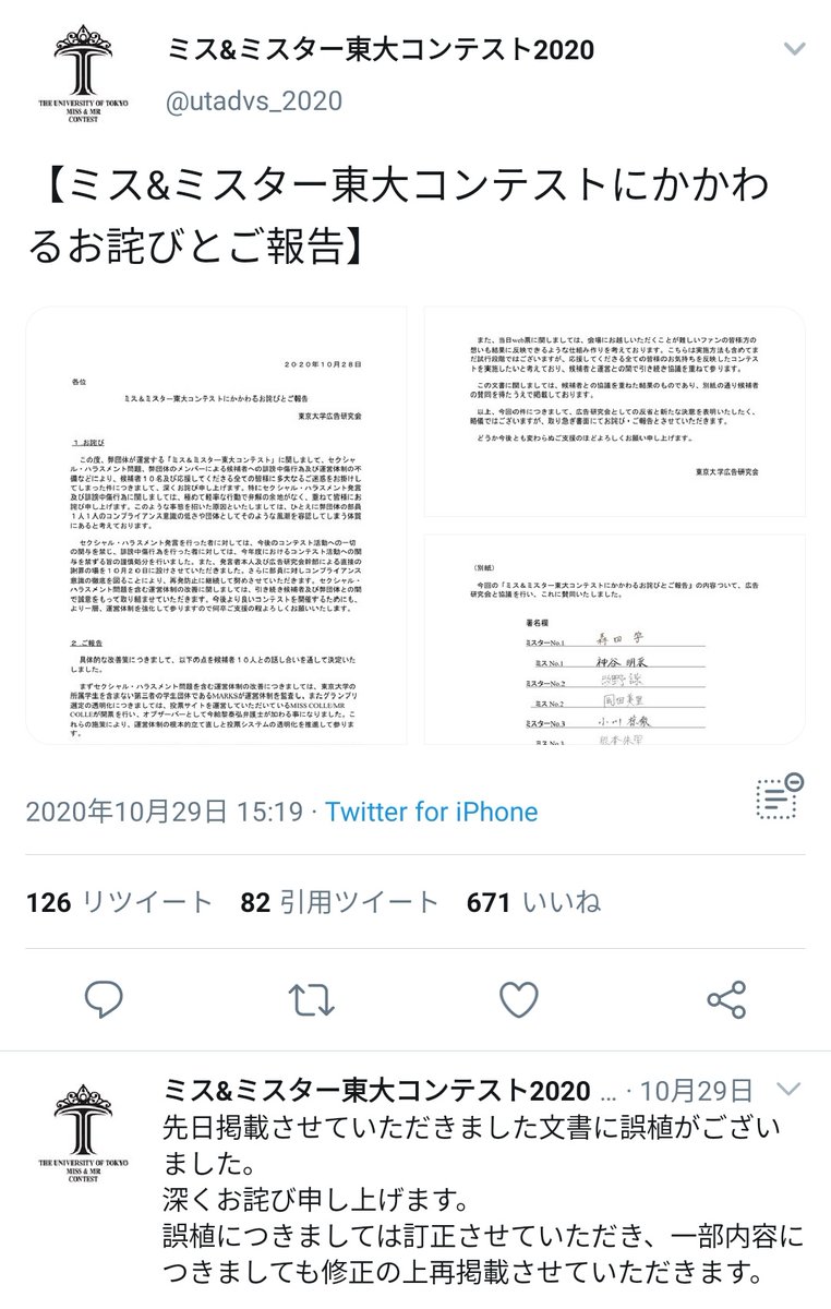 ミス東大が出来レースであることを匂わせる関係者のLINEのやり取りをミス東大運営アカウントのリプ欄に誤って投下したところ、ものの1分で非表示にされてしまいました