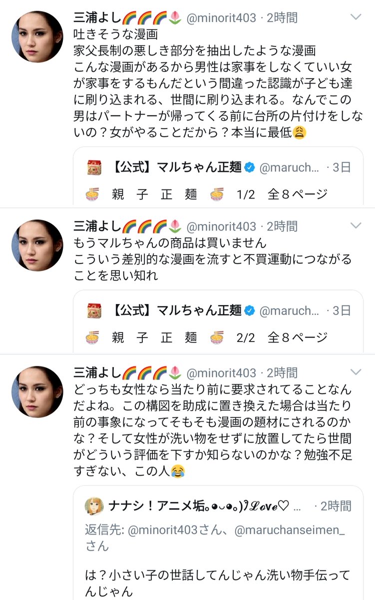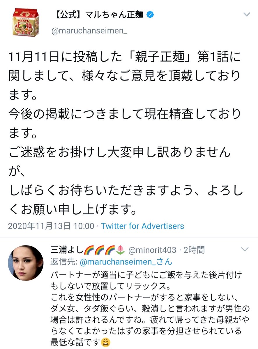 親子のほっこり日常を描いた漫画で、「男性ではなく女性にお皿を洗わせる描写」がツイフェミの目に留まり非難の的に。マルちゃん製麺は謝罪に追い込まれることに…
