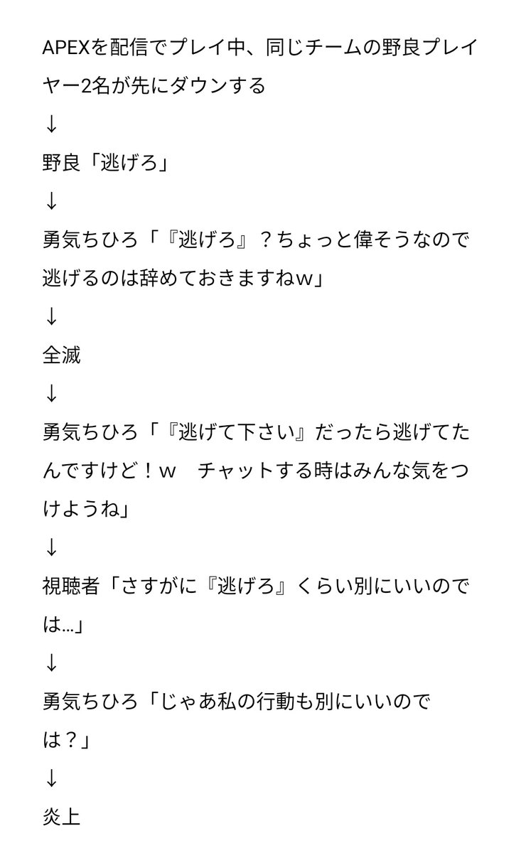 【APEX】「勇気ちひろ」というVtuberさんが炎上したんですが、炎上経緯が「野良プレイヤーとのAPEXプレイ中、野良から『逃げろ』と指示されたのに従わなかった」というあまりにもショボいものなうえ、勇気ちひろさんを勇気づけるリプの数々もなかなか"キテる"ものが多くて、なんか色々とすごいです twitter.com/chihiro_2434/s…