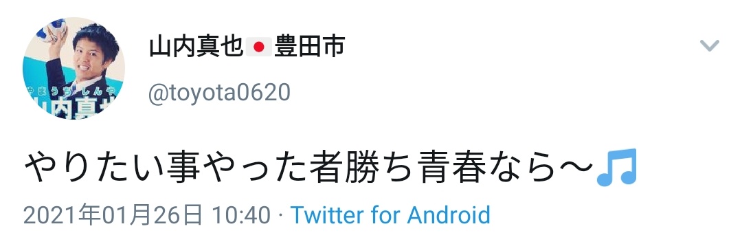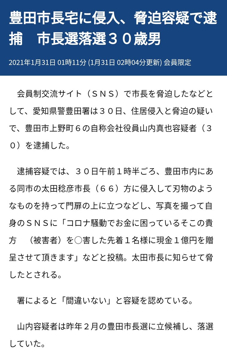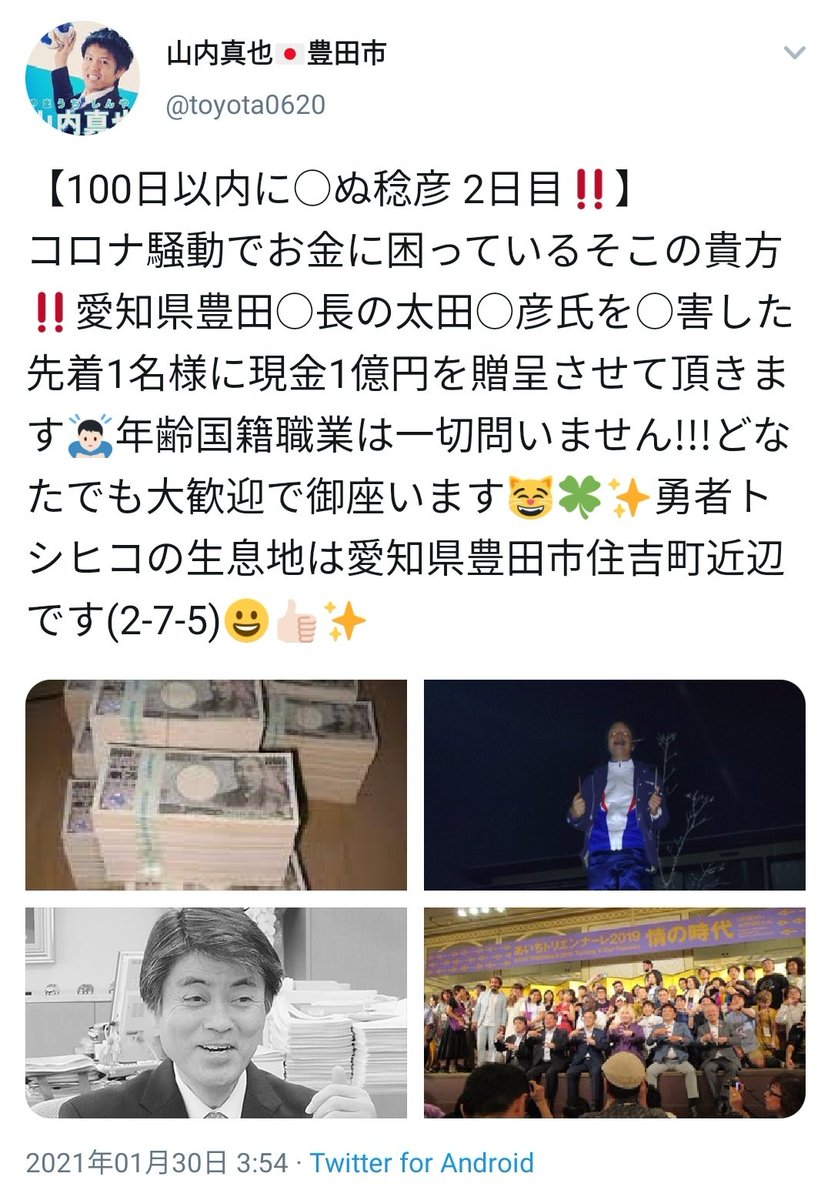 愛知県豊田市の市長候補山内真也さん(30)、Twitterで「現市長を○害したら1億円プレゼント!」と市長宅で包丁を持った写真をアップして逮捕される