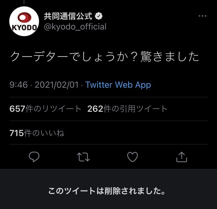 【悲報】共同通信さん、2連続で自演リプに失敗する @kyodo_official