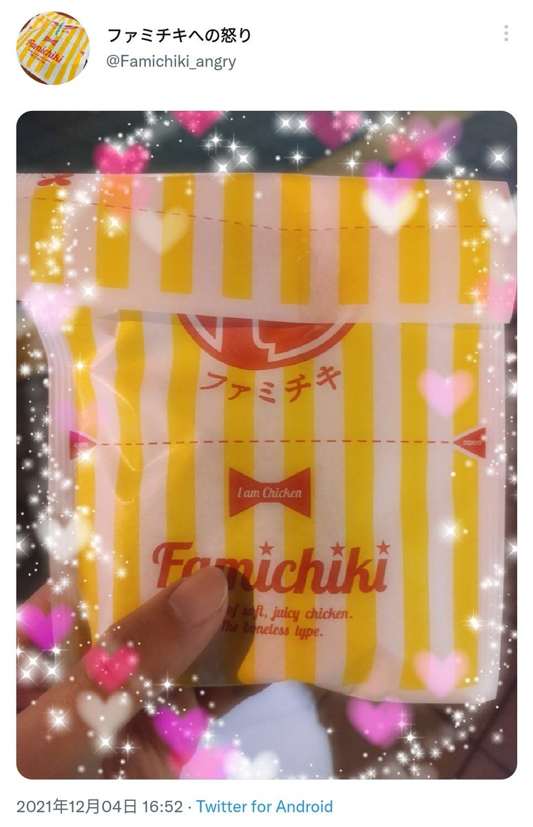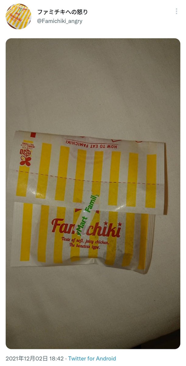 ファミチキの袋に貼られたテープが、食べやすいようにちぎる点線を超えていたらテンションが下がり、超えていなかったらテンションが爆上がりするだけのアカウント。Lチキ、ななチキなども守備範囲。