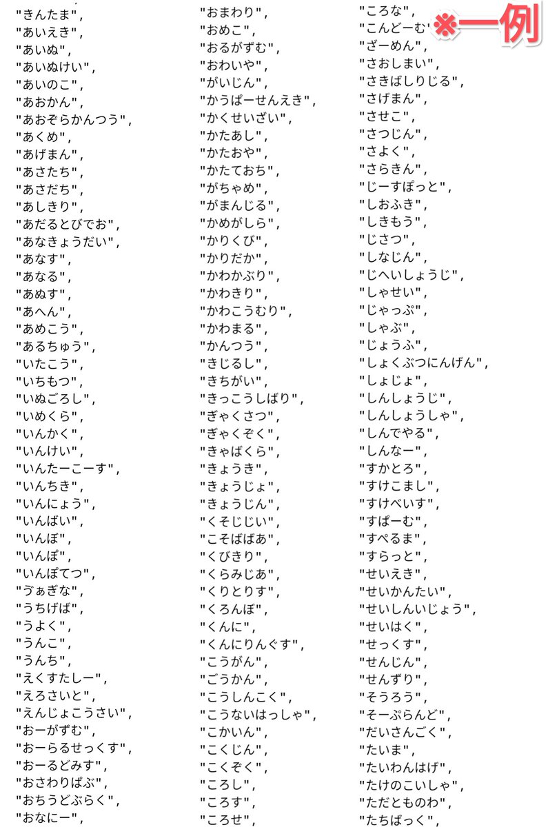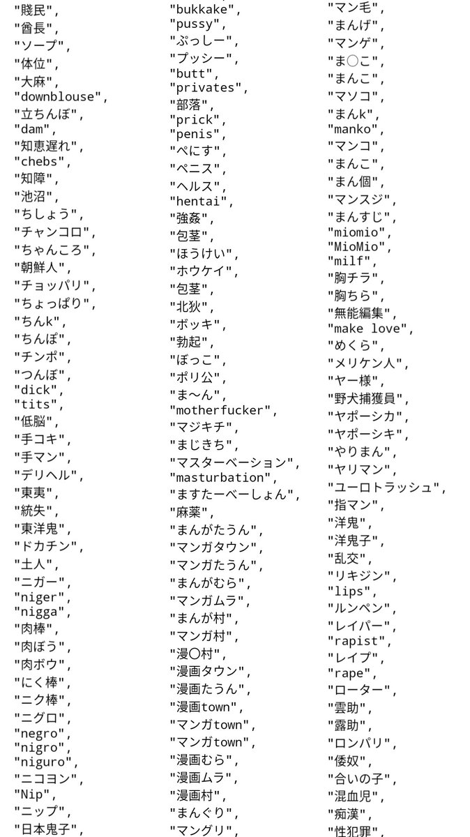 リスト内には「うんこ」などの下ネタや差別用語に加えて、「漫画村」「無能編集」といった単語も…