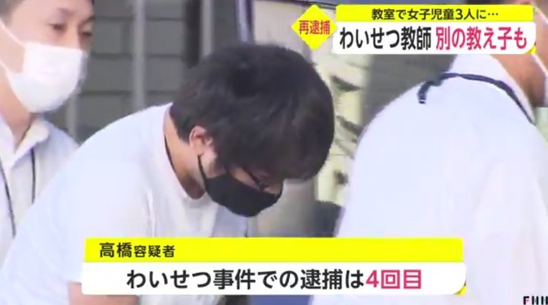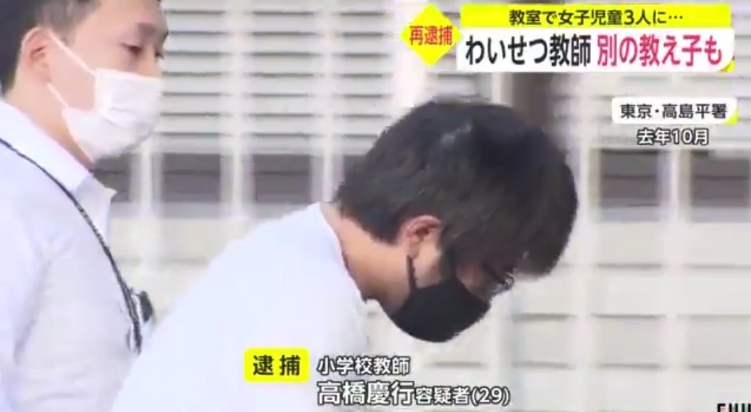 東京・板橋区立の小学校教師・高橋慶行容疑者(29)は、教室で女子児童3人の胸を揉んだ疑い。他児童も教室にいる休み時間中にじゃれ合うふりをして犯行。高橋容疑者が同様の事件で逮捕されるのはこれが4回目で、取り調べには黙秘している。