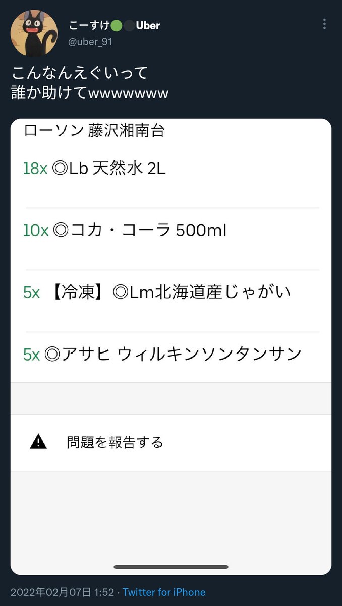【悲報】Uber Eats配達員さん、2リットルの水×18本、500mlのコーラ×10本、500mlの炭酸水×5本の配達を命じられてしまう @uber_91
