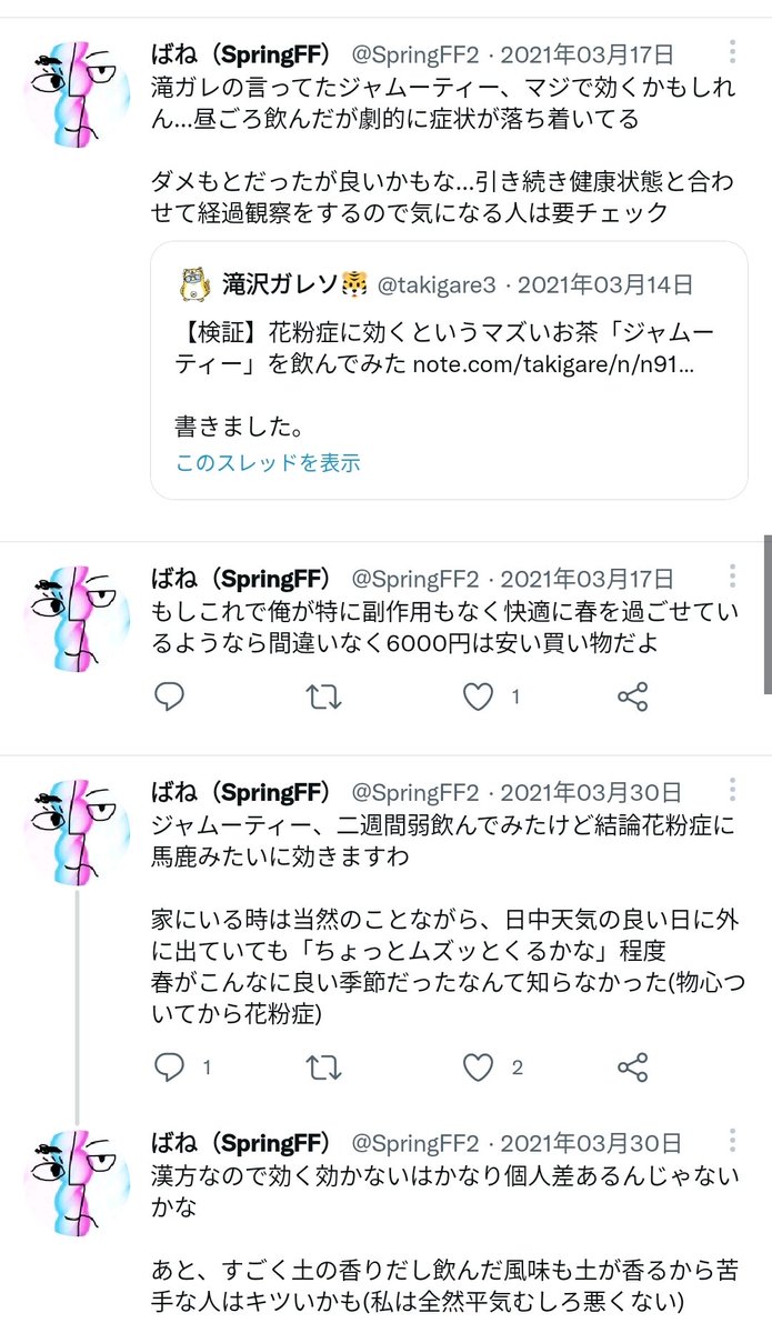 【業務連絡】花粉がヤバい季節になったので、例の「美味しくないけど花粉症に効く謎のお茶」を再掲しときます。