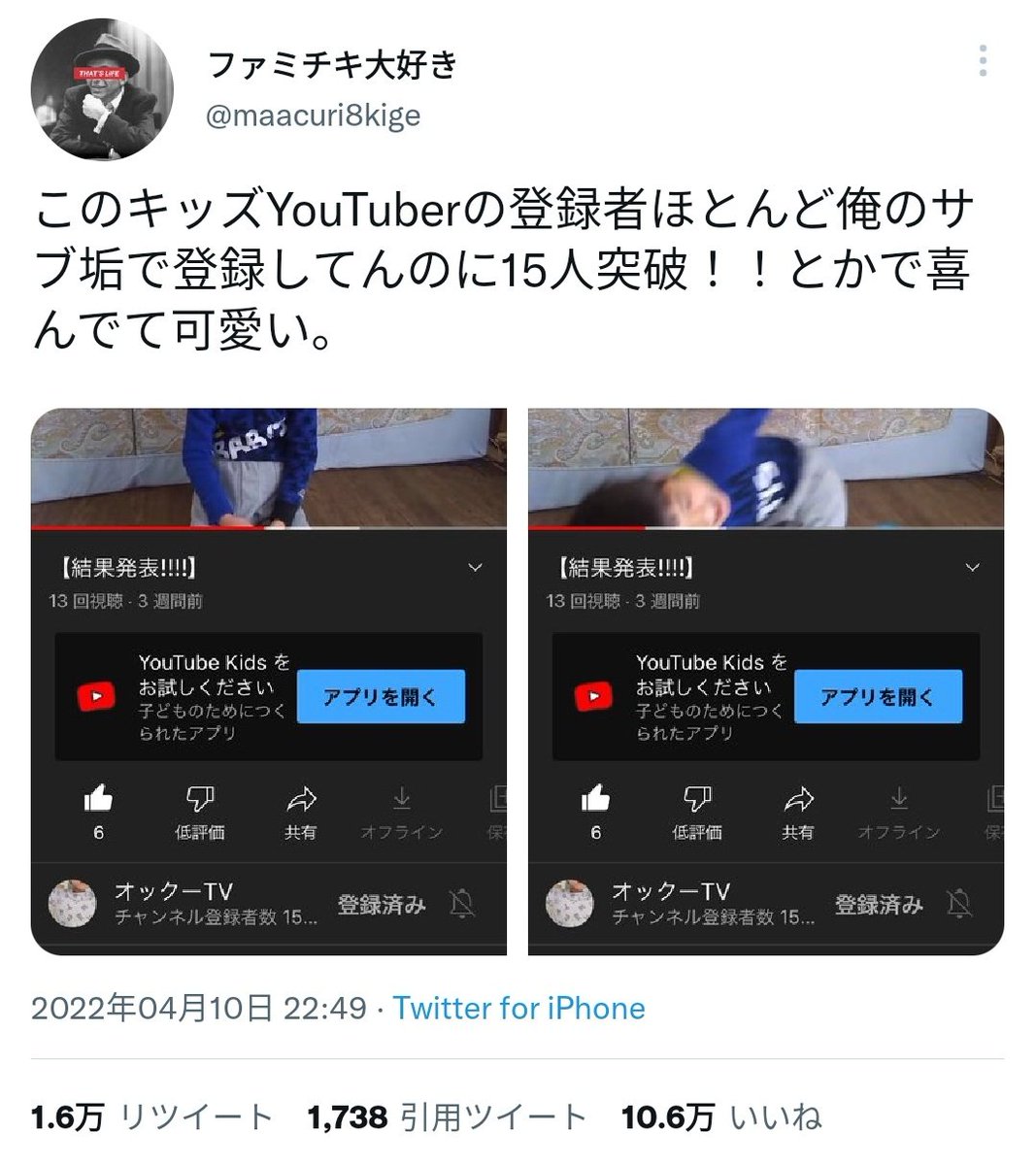 チャンネル登録者数15人、キッズYouTuber「オックーTV」さん、『チャンネル登録15人突破で喜んでるの可愛い。ほぼ俺のサブ垢なのに…』というツイートがバズる