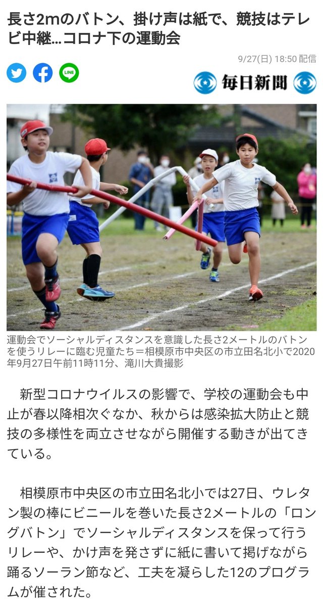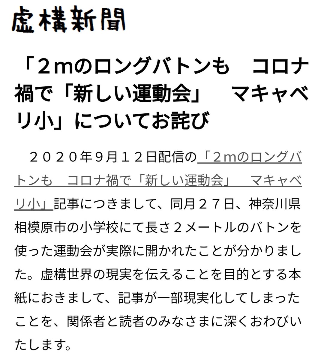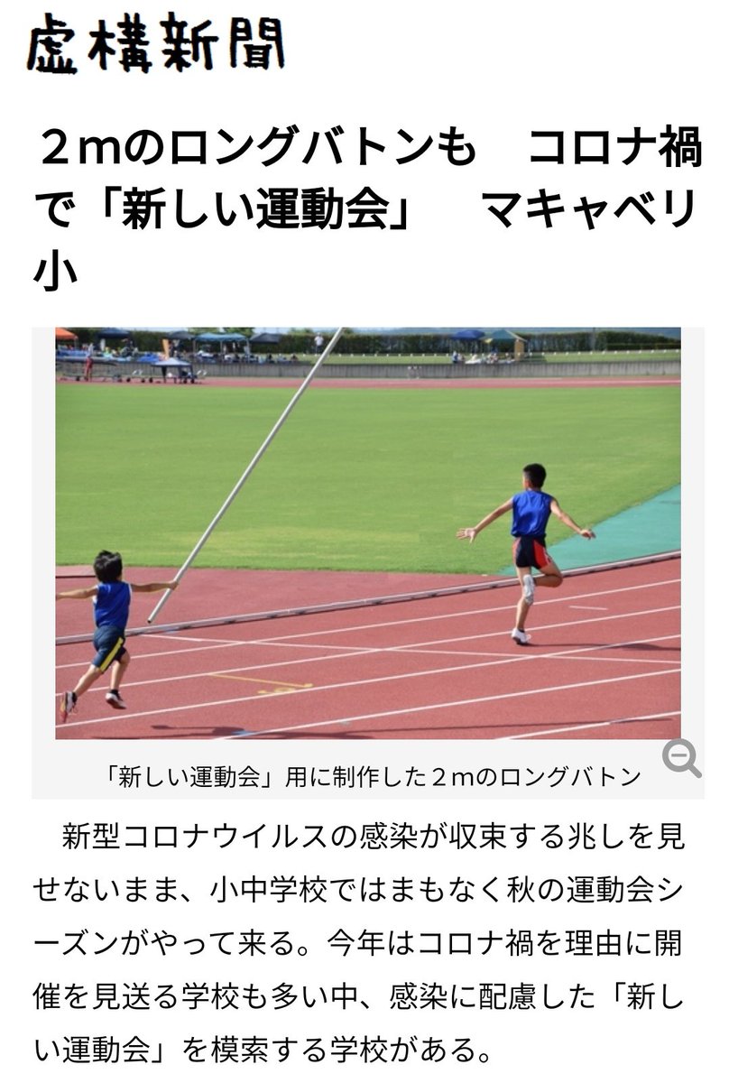 虚構新聞が「コロナのせいで運動会のバトンが2メートルに」というジョーク記事を掲載