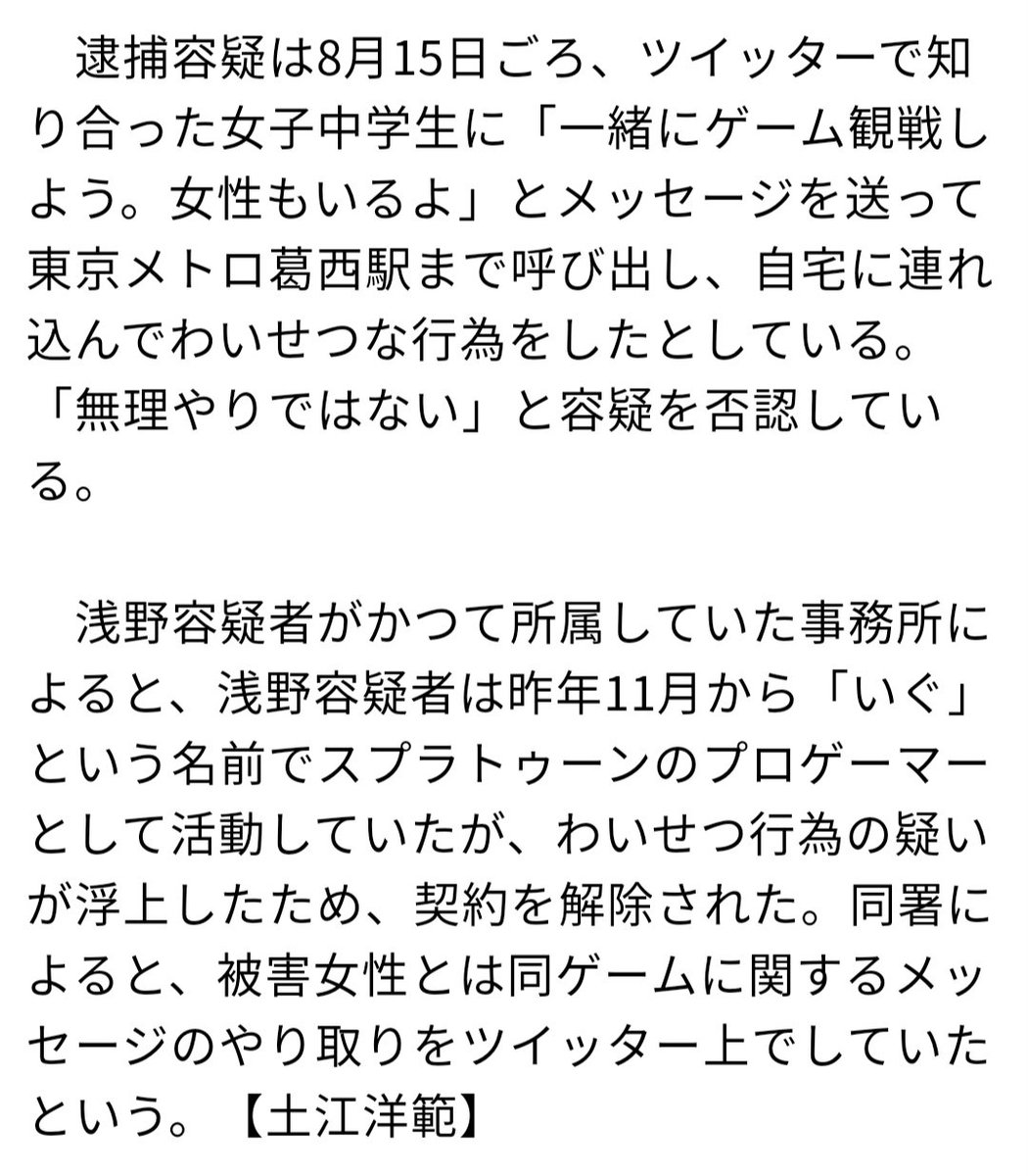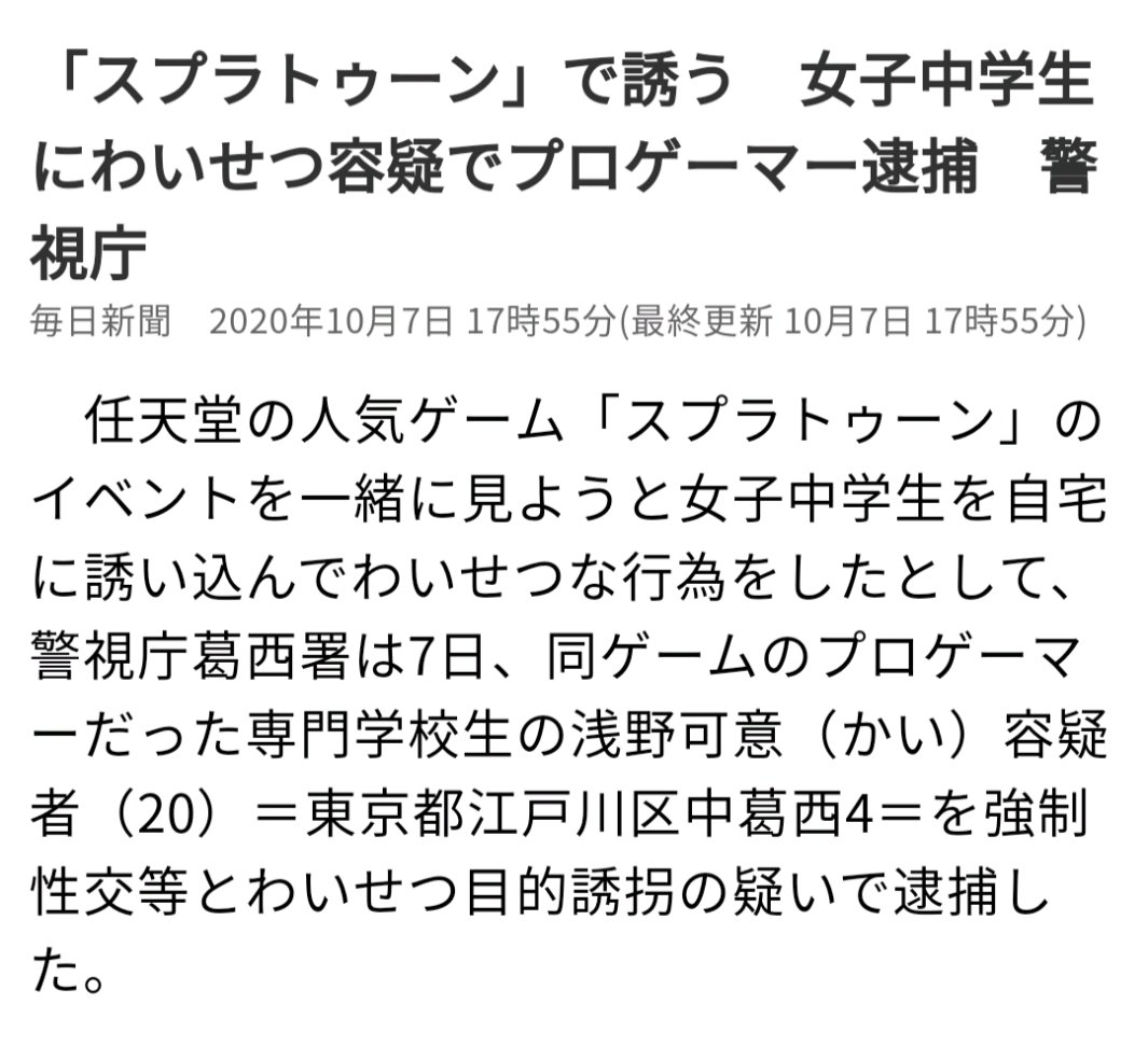 「スプラトゥーン」で誘う 女子中学生にわいせつ容疑でプロゲーマー逮捕 警視庁 - 毎日新聞 mainichi.jp/articles/20201…
