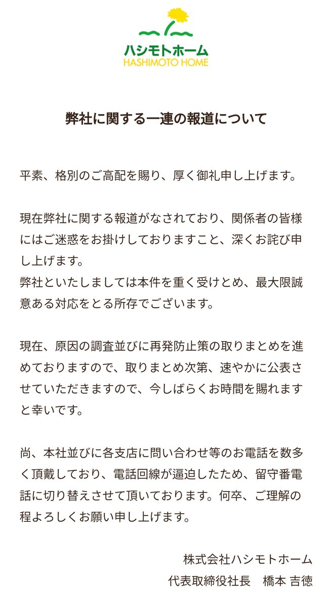 【続報】“症状”授与のハシモトホーム社、公式HPにて謝罪「重く受け止め最大限誠意ある対応を取る」