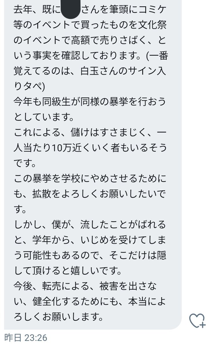 なお会長は「高校生は悪くない」と述べていますが、今回コミケ代行を企画した生徒と同じ高校(筑波大付属駒場高校)の生徒から「うちの学校には文化祭で"競り"が行われる特殊な文化がありそこでコミケグッズの高額転売が流行っている」というDMを頂きました