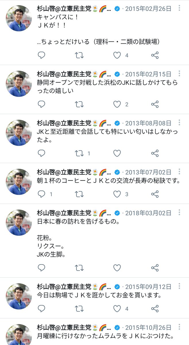 【悲報】愛媛4区に出馬中の立憲民主党所属 杉山啓さん、ひたすらに女子高校生が好きすぎる過去ツイが発掘されてしまう @K_sgym1116