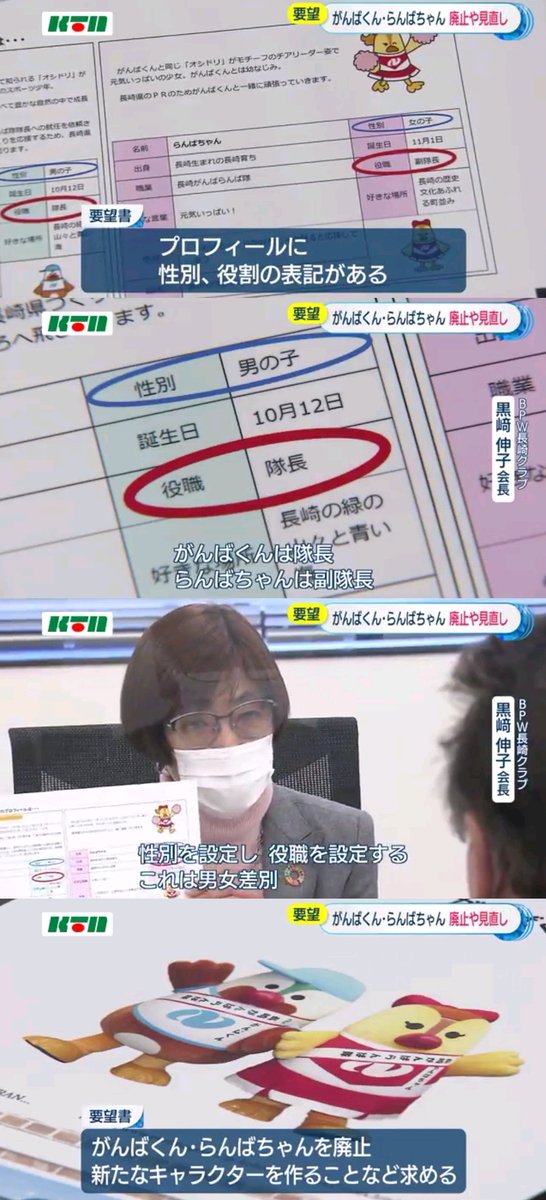 BPW長崎クラブ黒崎会長「がんばくんには隊長、らんばちゃんには副隊長という設定。性別を設定し、さらに役職を設定する──これは明確な男女差別」