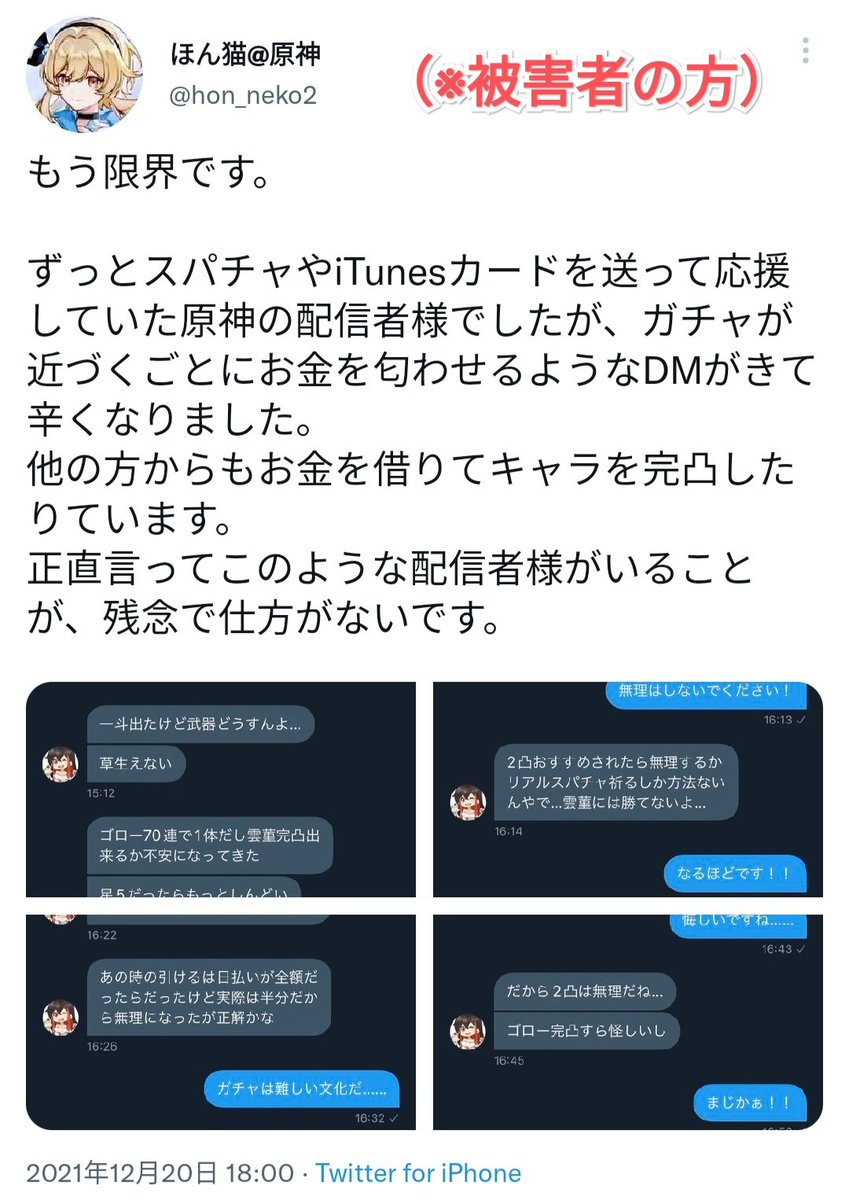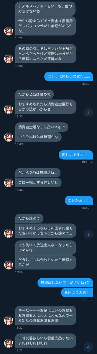 視聴者に対して執拗にガチャ資金を要求し、「このままお金くれないなら臓器売買ガチャか消費者金融ガチャに手を出す」と決死の脅迫で目標金額の獲得を目指す
