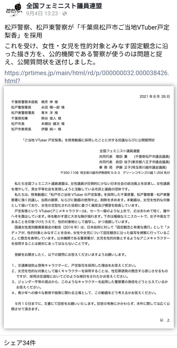 フェミ団体"全国フェミニスト議員連盟"が「女性・女児を性的対象とみなす描き方をやめろ!」とクレーム