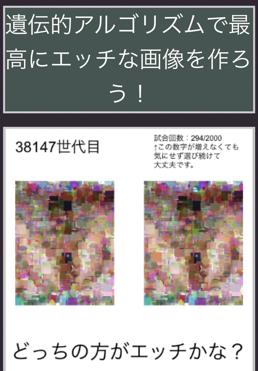 【悲報】人気企画「遺伝的アルゴリズムでエッチな画像を作ろう!」、ガチでリアルなエッチ画像が完成しそうだったため急遽サービス終了