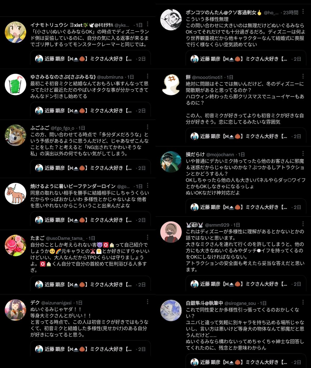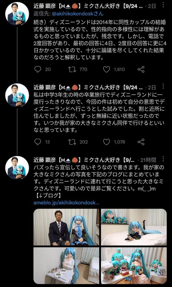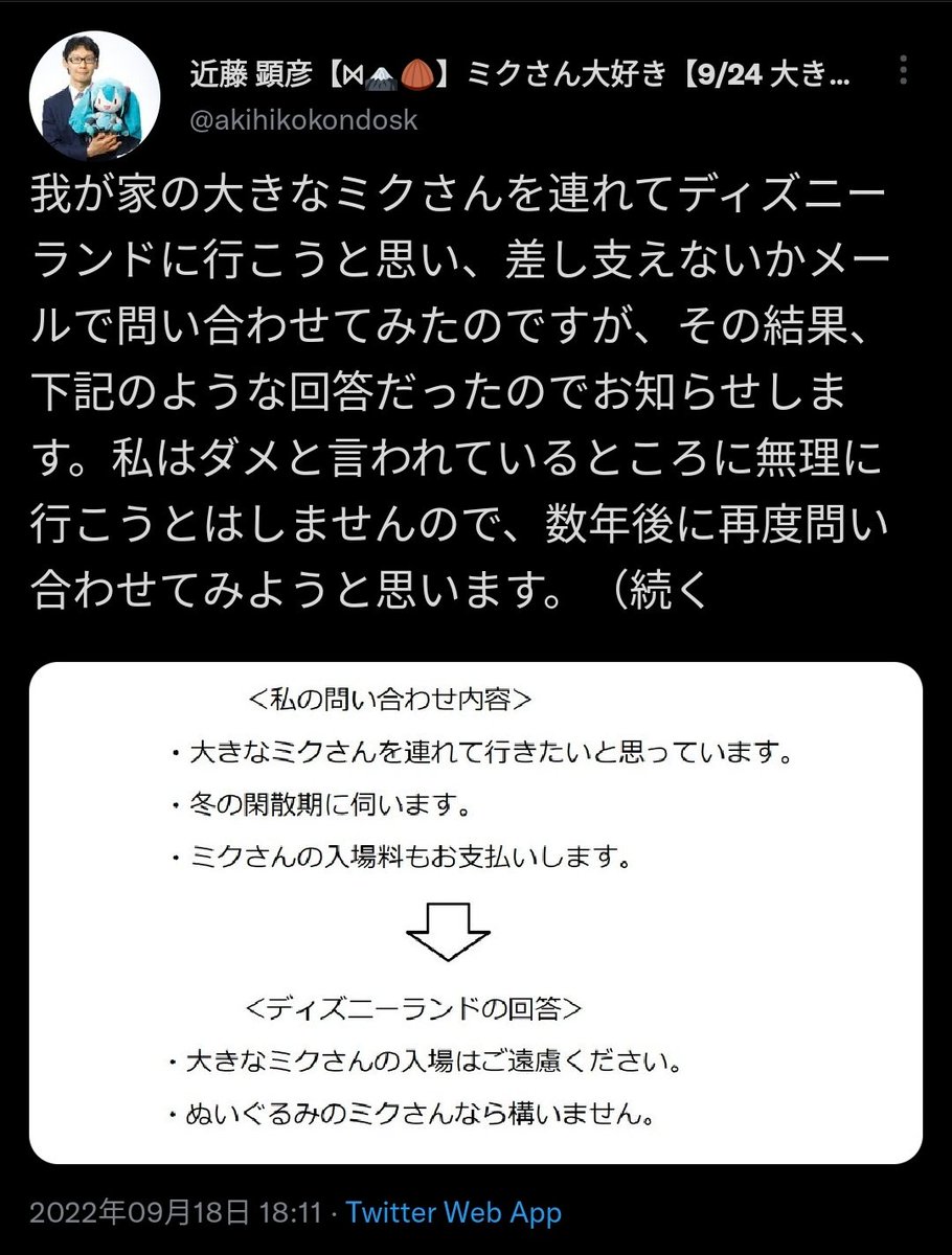 初音ミクと結婚した男性、大好きな初音ミク(等身大)をディズニーランドに入園させられるか問い合わせる
