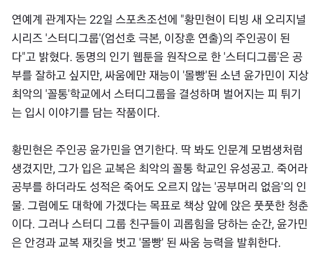 [단독] 황민현, 이번엔 액션괴물..'스터디그룹' 주인공 (출처 : 스포츠조선 | 네이버 TV연예) naver.me/FCBU2RNR