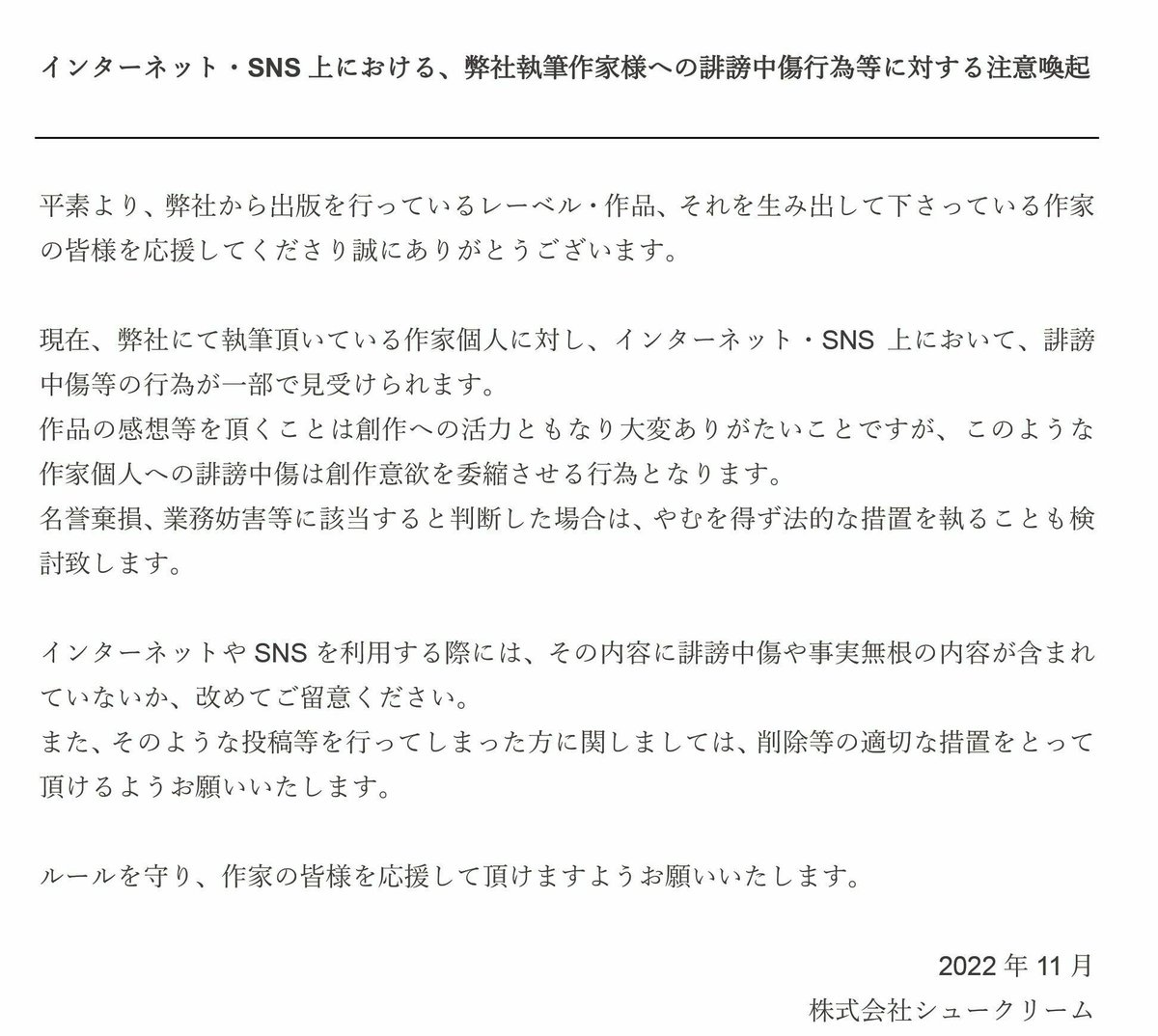【お知らせ】インターネット・SNS上における、弊社執筆作家様への誹謗中傷行為等に対する注意喚起