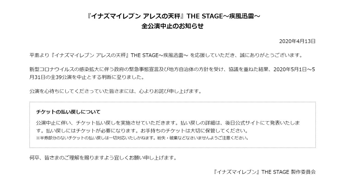 【重要】『イナズマイレブン アレスの天秤』THE STAGE~疾風迅雷~全公演中止及びチケット払い戻しについてのお知らせ