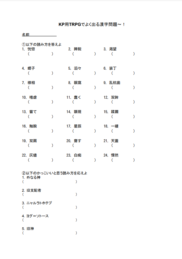 『KP用TRPGでよく出る漢字問題~!』