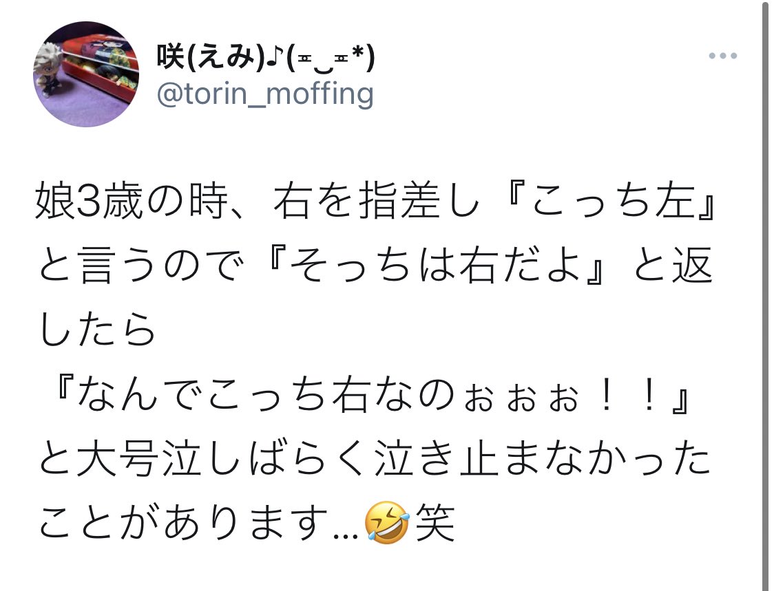 「1歳育児は何で泣いてるのか分からない時があるから大変」と友達に愚痴ったところ、「3歳になると今度はこんな理由で泣くの?って事で泣くから大変だよ」と言われたので、具体的な例を聞いてみたら「ママの名前がママじゃなかったことにショックを受けて息子が大泣きした」って回答がきて戦慄しました