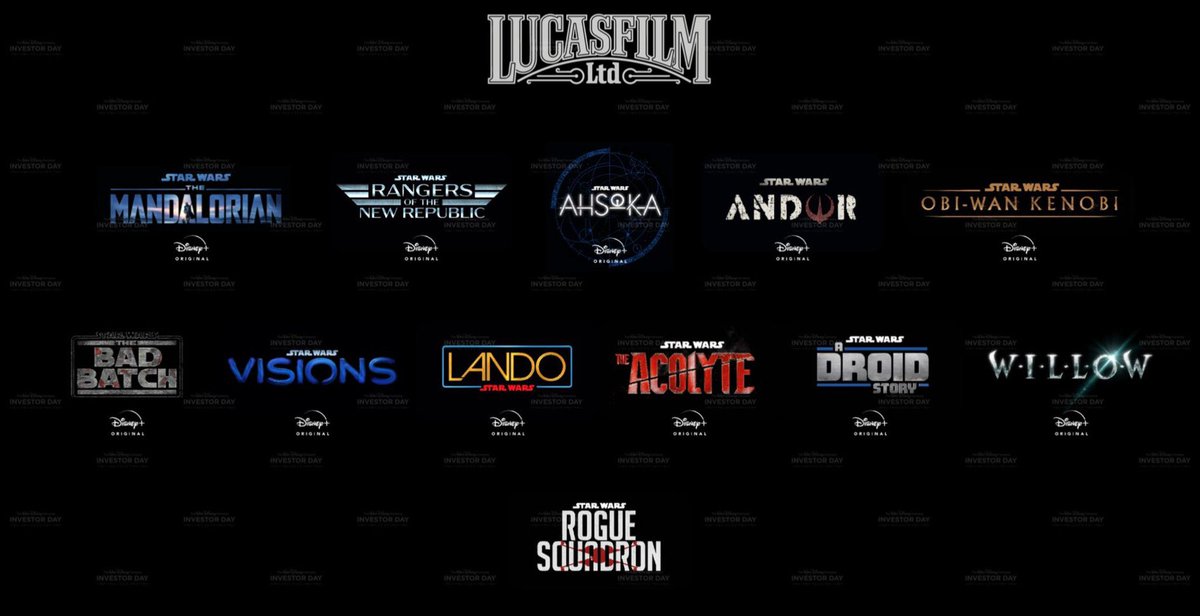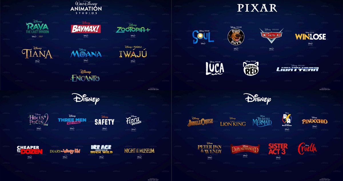 今日ディズニーが発表した大まかなラインナップ。Disney+のシリーズ物から、劇場公開作品まで、あまりにも多すぎる。Marvel、Star WarsをはじめとしてPixarやディズニーアニメーション、実写プロジェクトなど様々。『ズートピア』『モアナ〜』のオリジナルシリーズもやるってマジ!?