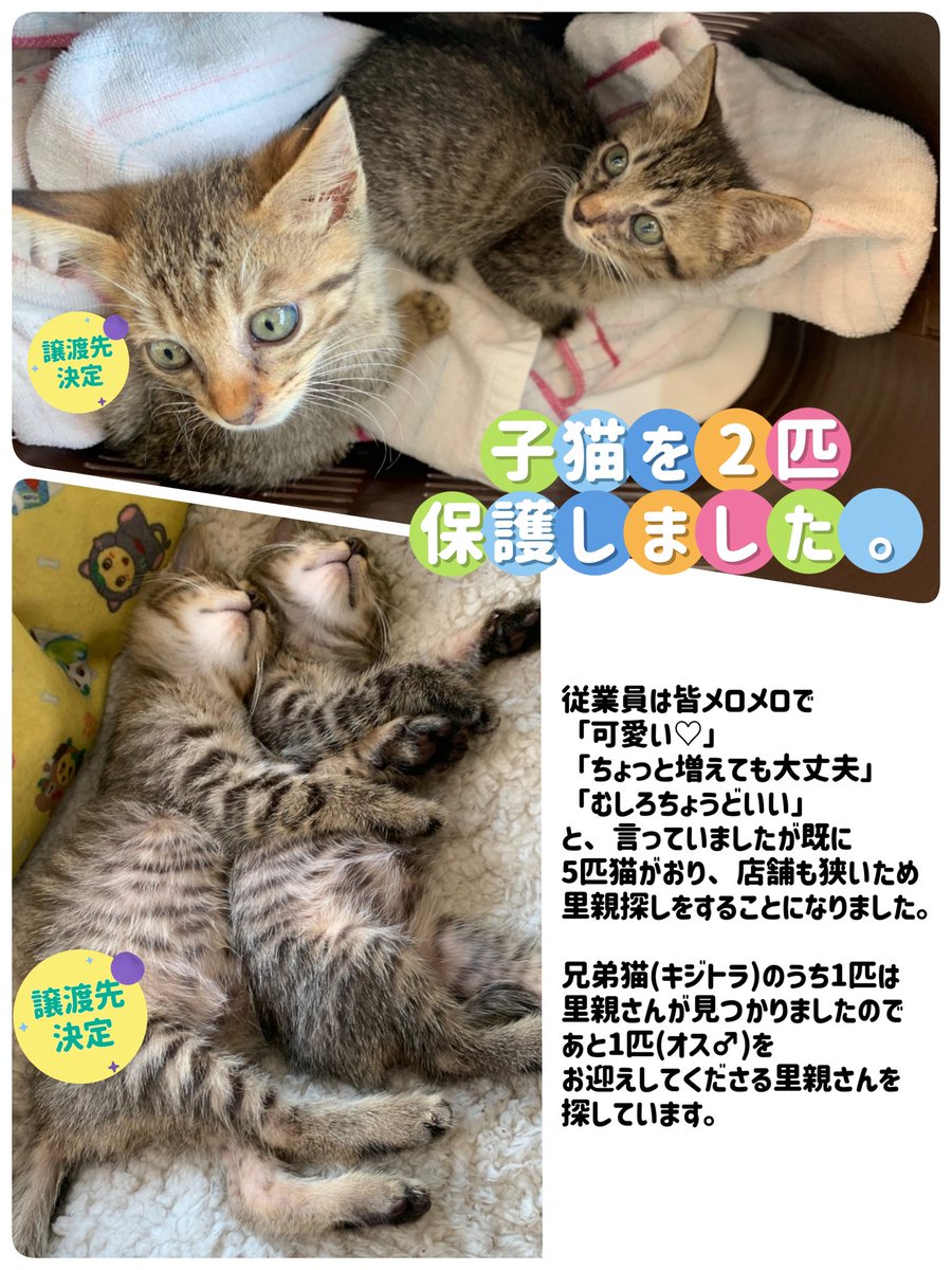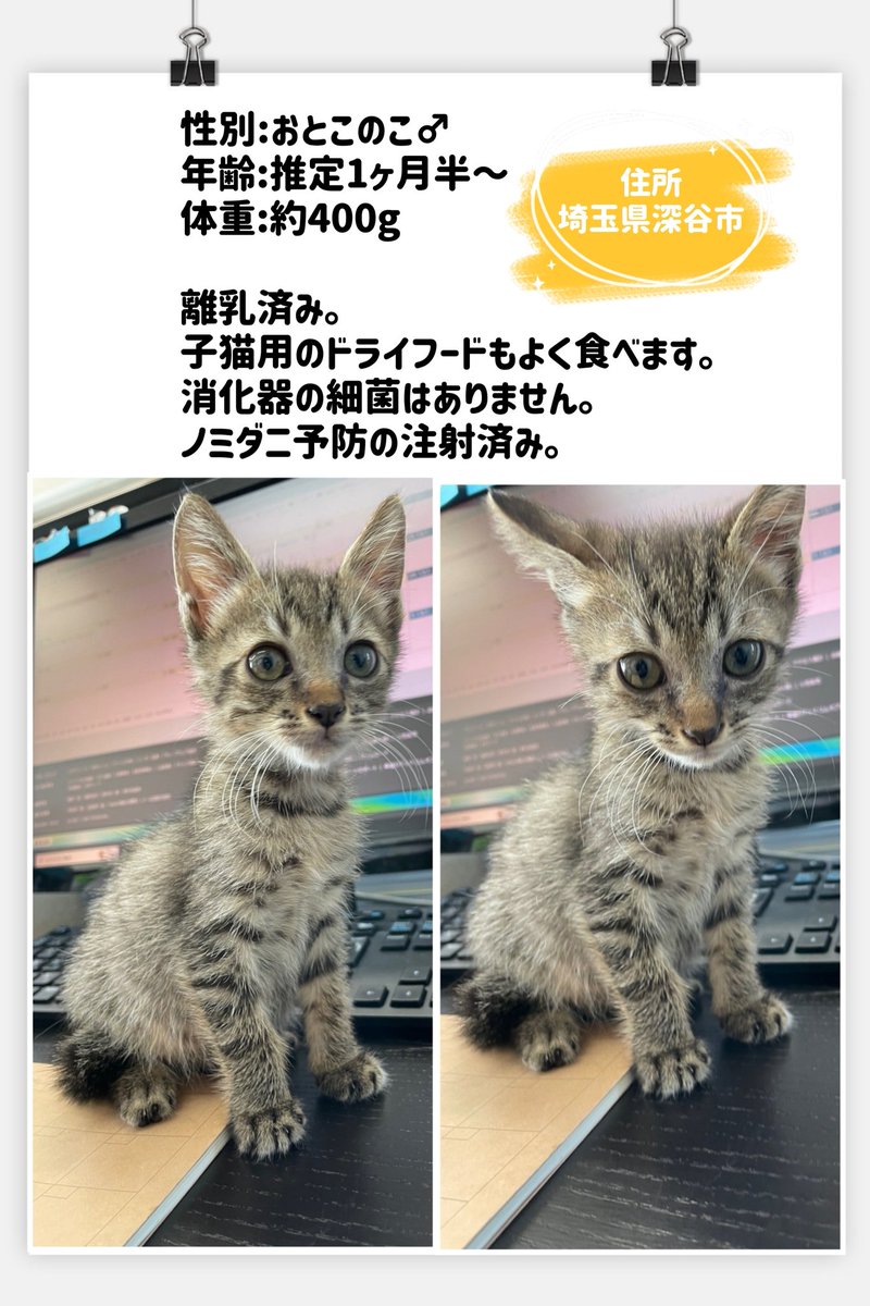 子猫を2匹保護しました。 1匹をお迎えしてくださる 里親さんを探しています。 場所は埼玉県の深谷市です。 気になる方、お迎え希望の方がいらっしゃいましたら 下記の写真の内容と条件を把握した上で DMでお声がけください。 よろしくお願いします。